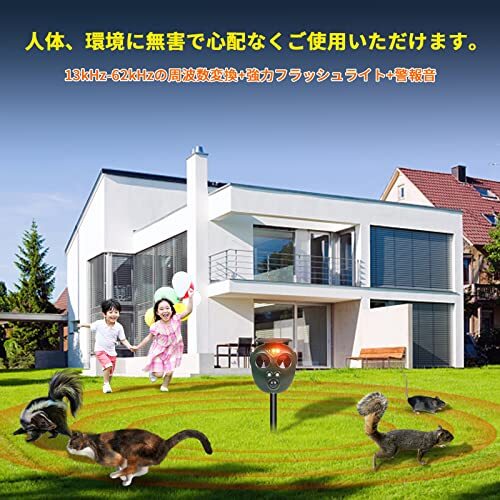 【6モード猫よけ&センサー調節可能】この害獣撃退器は広範囲超音波.警報音とLEDフラッシュ組み合わせた総合6つのモードがありま.周波数は13kHz〜62kHzの広い範囲、多種類の動物を対応して撃退できます。LEDライトを搭載、超音波の特定の周波数に適応してしまい受けにくくなる有害動物も、強力なLED点滅ライトと警報音で効果的に追い払います。また、センサー調節できます。電源をONにした時、センサーの感度は高・中・低の3段階で設定できます。(高感度1回鳴り -中感度2回鳴り ー低感度3回鳴り。超音波センサーのため、少し音が聞こえます。人と動物に無害ですが、室外に置いた方をおすすめいたします。)