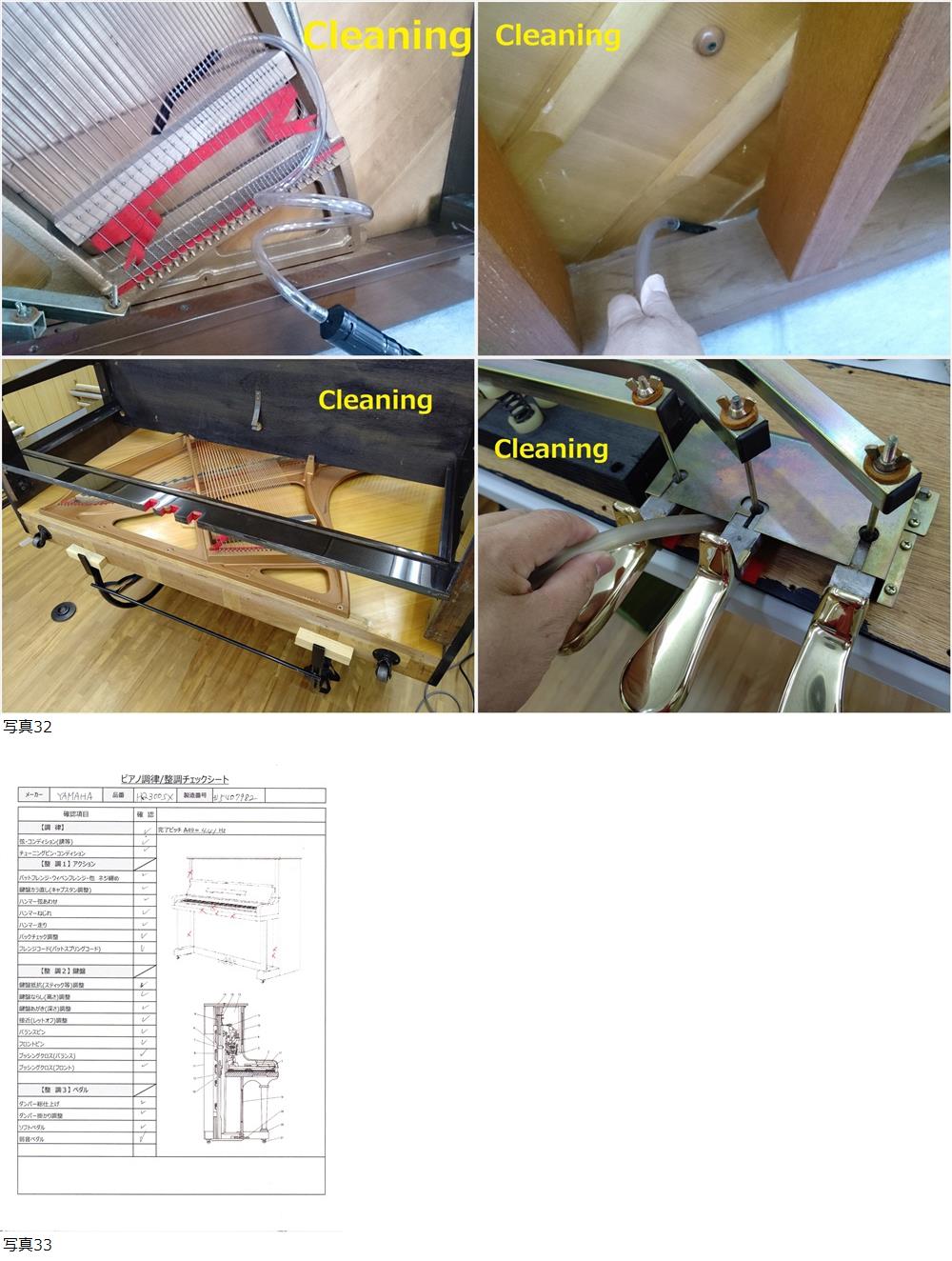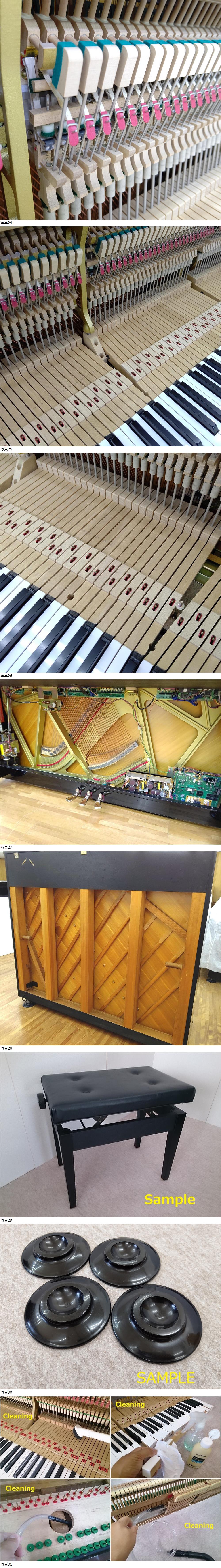 | ◆内部機能の調整(整調作業)は各項目にわたりチェックし、必要な調整作業を施しています。画像33【調律/整調チェックシート】参照 ◆外装は各部品を分解して個々に研磨美装し組み上げているのできれいに仕上がっています。 ◆内部・裏側は専用器具で丁寧にクリーニングをしました。特に鍵盤はお子様がお使いになることを想定し、念入りに3回の作業工程(除菌含む)で仕上げています。画像31.32(Cleaning画像はイメージです同等の作業を行っています) お越しいただいた方にいつでも試弾していただけるよう調律をしていますが、運搬時の振動による影響も考えられますので、搬入後に状態をみて落札者様で実施されることをお勧めします。ピアノは内・外装とも丁寧にチェックして出荷いたします。 | ||