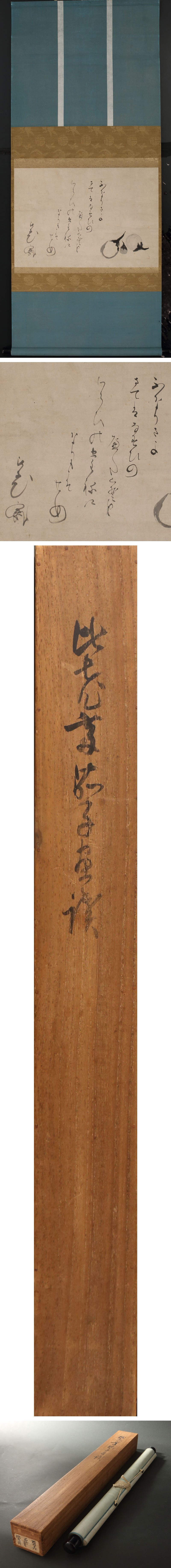 藪内比老斎の自画賛です。 茄子の画に、「不なりさよ扨(さて)はなすびのへたくそを わらひの種になりもこそせめ」と着賛しております。 不住斎が得意とした茄子画賛、そして元禄期に流行した豊穣を祈る俗謡「なれなれなすび」のパロディといった所でしょう。初夢を題材に取り合わせても面白い逸品です。 ◆藪内比老斎 江戸後期の茶人。藪内家6世。号は竹陰。竹心四天王の一人である北尾春倫の甥で、不住斎の養子となる。書を池大雅に学び、謡曲や和歌に長じ、作陶にも秀でていた。円山応挙とも親交があった。寛政12(1800)年没。74歳。 付属:識箱が付属します。 寸法:高さ122cm、幅52cm(最大幅。若干の誤差はご了承下さい) 状態:経年のイタミがございます。 |