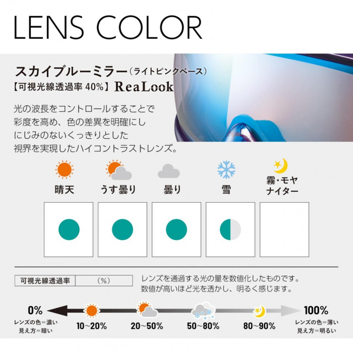 | 歪みの少ないワイドな視界が特長の平面レンズ。ハイコントラストレンズ「ReaLook / リアルック」により雪面の凹凸をしっかり捉えます。 |
