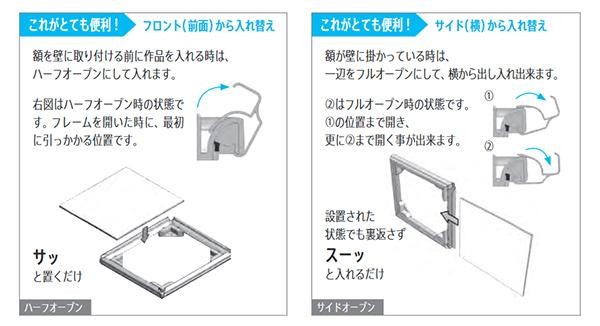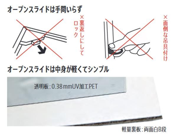 | オープンスライド式で4辺どこからでも出し入れが可能です。 ●変色防止UV加工PET使用 ●壁への打ち付け可能商品 ●前面開閉タイプ ※お使いのPCモニターの設定によって、実際の商品と色味が若干異なる場合がございます。ご了承ください。 |