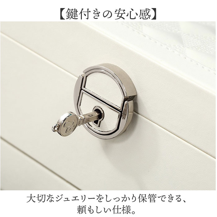 | 商品説明 | ・・【スッキリ収納】 ・大容量で整理上手に♪鍵付きジュエリーボックス。 ・【シンプルで上品】 ・装飾を抑えたお部屋の雰囲気に合わせやすいデザイン◎ ・【2段式でたっぷり】 ・リング、ピアス、ブローチやネックレスまで、種類別に分けて収納できる設計。 ・【鍵付きの安心感】 ・大切なジュエリーをしっかり保管できる、頼もしい仕様。 ・【傷を防ぐ内貼り】 ・ベロア調素材の内貼りで、お気に入りのアクセサリーを優しく守る。※仕切りは取り外しが出来ます。 |