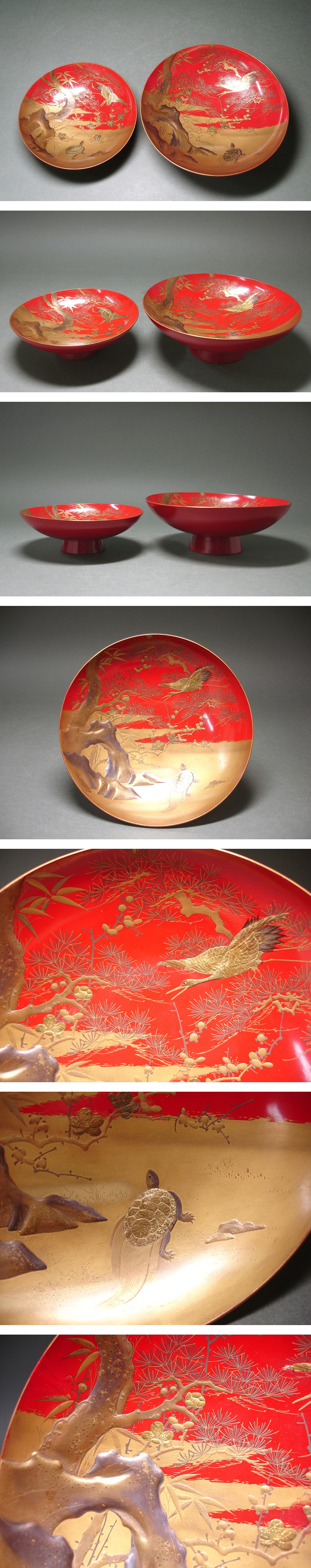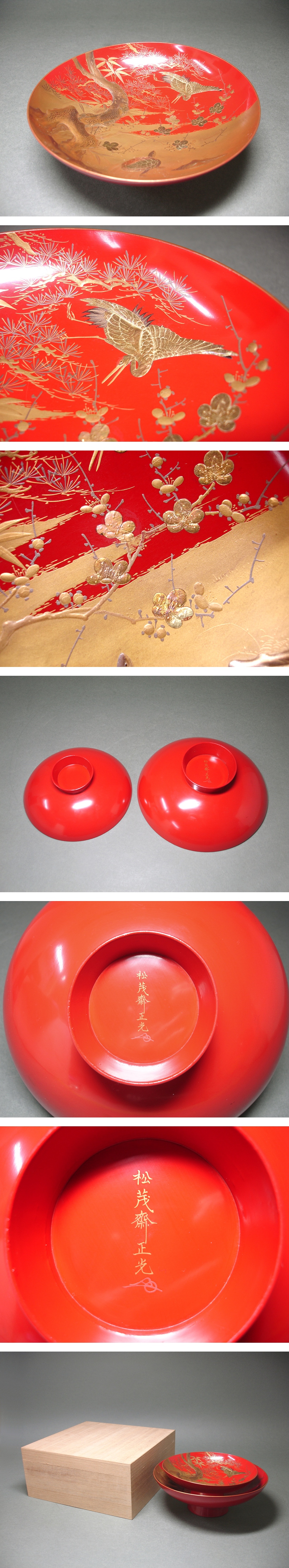 慶應◆江戸時代後期 印籠蒔絵師【松茂斎正光】作 朱漆松竹梅鶴亀蒔絵盃 大小重ね 收藏
