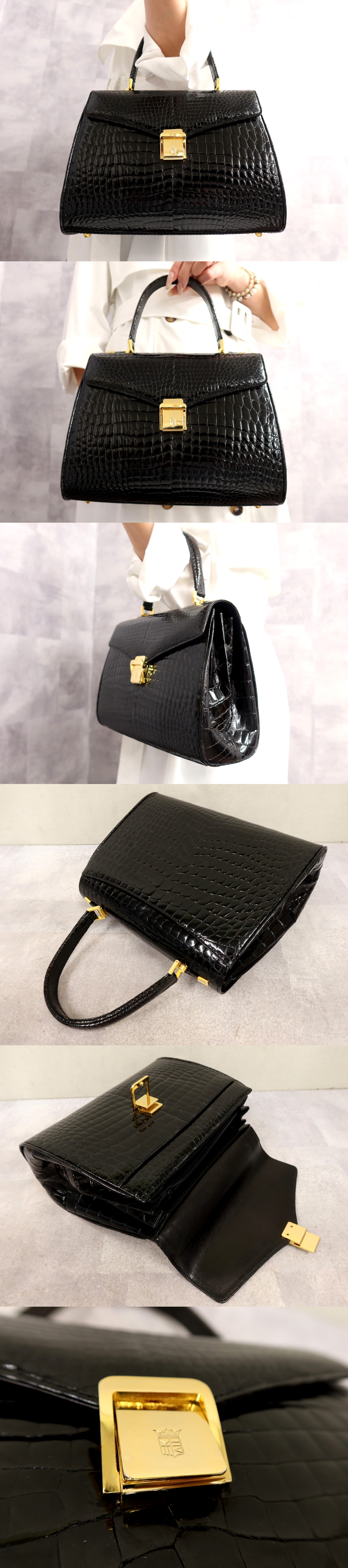 ●超美品●BISMO ビスモ●トップハンドル●シャイニング クロコダイル 本 ワニ 革●ハンド バッグ●黒●ゴールド金具●腕掛け●Js66732 收藏
