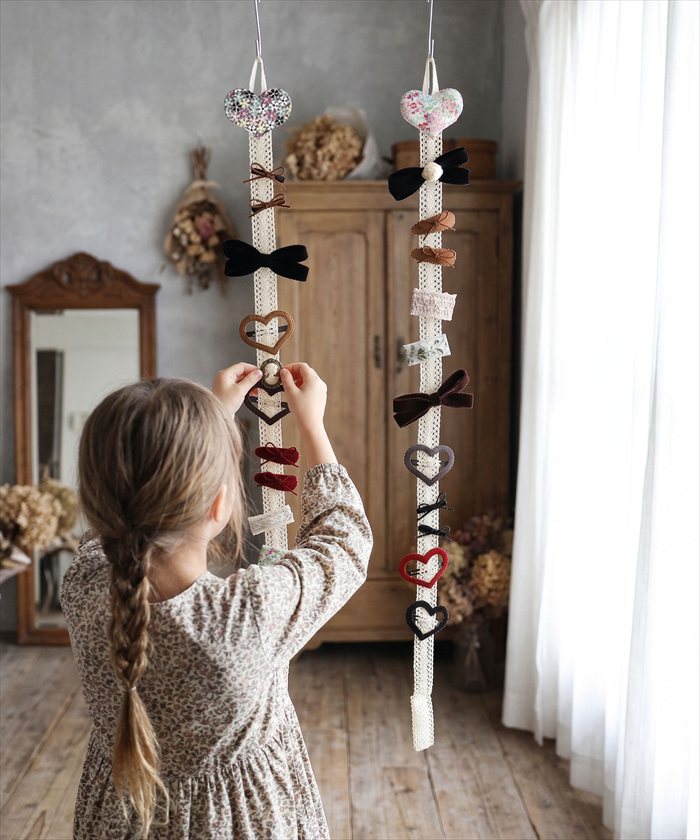 | 商品説明 | ・・女の子の憧れが詰まった、ハートモチーフが可愛い「ハート ヘアピンホルダー」。 ・お気に入りのヘアアクセサリーをどこにしまったか忘れてしまうことはありませんか? ・このホルダーなら、壁にかけるだけでお部屋がまるでショップのような空間に早変わり♪ ・毎朝のヘアセットの時間も、お子様が自分で「今日はこれ!」と選ぶ楽しさが生まれます。 ・レースのリボンにお気に入りのクリップをパチンと留める作業は、 遊び感覚で楽しくお片付けの習慣づけにもぴったりです。 ・下のループにはカチューシャも掛けられるので、 散らばりがちな小物もまとめて可愛くディスプレイ♪ ・ピンクとパープルの優しい花柄ハートが、子供部屋のインテリアを愛らしく彩ります。 |