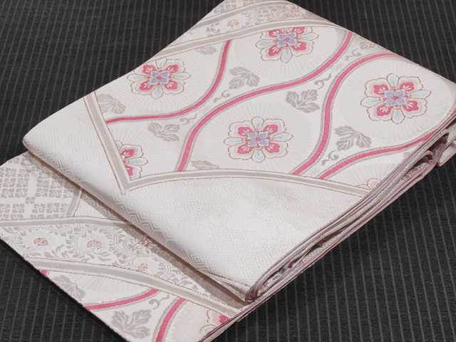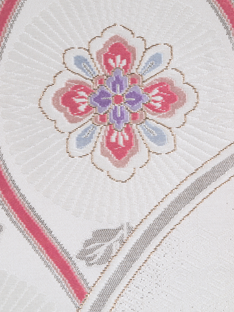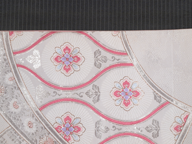 | 詳細 | 全体の印象としては、白銀色の地に、唐花菊の配された立涌と唐草や亀甲、入れ子菱、唐花襷(たすき)などの配された熨斗などの文様が織り込まれている、西陣織の袋帯です。 プラチナ箔と本金箔が用いられ、品の良い、洗練された輝きを放っています。かわいらしいお色目ですが、透明感が感じられます。 ユーズド品で、前の折り跡がうっすらとあるほか、たれ上のお太鼓で隠れる部分、お太鼓の裏に回る部分に直径約 1~2cm の薄めの黄変が各 1 か所ずつありますが、いずれもご着用時には隠れるので気にはなりません。文様部分の織りにややゆるみのある部分が若干ありますが、ほとんど判別はつきません。目につくしみやよごれなどのダメージもなく、全体的にはきれいな状態です。 |