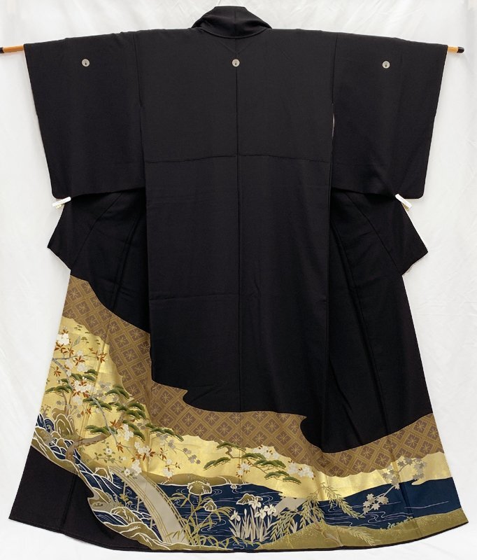 ●きものマーチ●黒留袖 桜と松に橋文様 業平菱 金彩 比翼付き 五つ紋 ふき綿入り●美品 410mo63 收藏