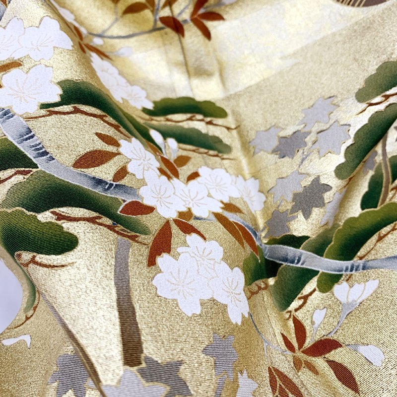 | ●黒留袖 桜と松に橋文様 業平菱 金彩 比翼付き 五つ紋 ふき綿入り●美品 (No.fd) 黒の縮緬地には立派な枝ぶりの桜と松に、見事な橋ががかった川辺の風景がございます。杜若の咲いた八つ橋文様や、業平菱の雲など。金彩がふんだんに施された日本らしいデザインが素敵な品格ある黒留袖です。(画像の帯410my13や小物は参考商品で、本品には含まれません)。 比翼付きです。五つ紋(陰丸に抱き茗荷)がございます。お着物の裾にふき綿が入っています。 比翼の袖口裏にとても薄い汚れございますが隠れる部分です。その他、表地などには特筆すべきダメージのない美品です。 【素材】正絹 【色】黒 *モニターによって色味は実際と異なる場合がございます。 【サイズ】裄:63.5cm、丈(肩から):157cm、袖幅:33cm、袖丈:47.4cm、前幅:24.2cm、後幅:29.1cm、縫込み 身頃側:4.8cm、お袖側:2.5cm、内揚げ幅:10.5cm *素人採寸のため、多少の誤差はご容赦ください。 上質な逸品ですので、いかがでしょうか?よいお品物でお勧めです^^ | |