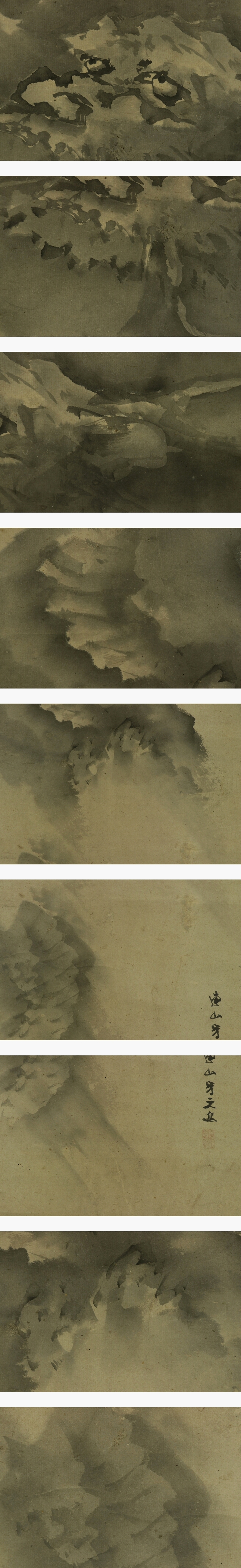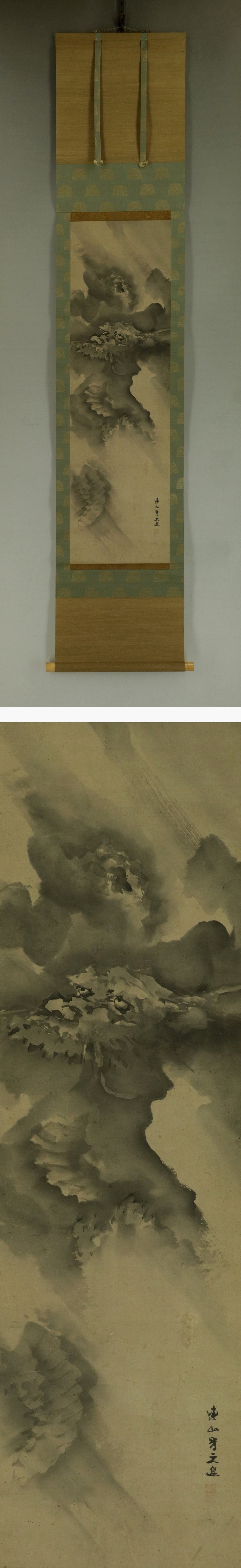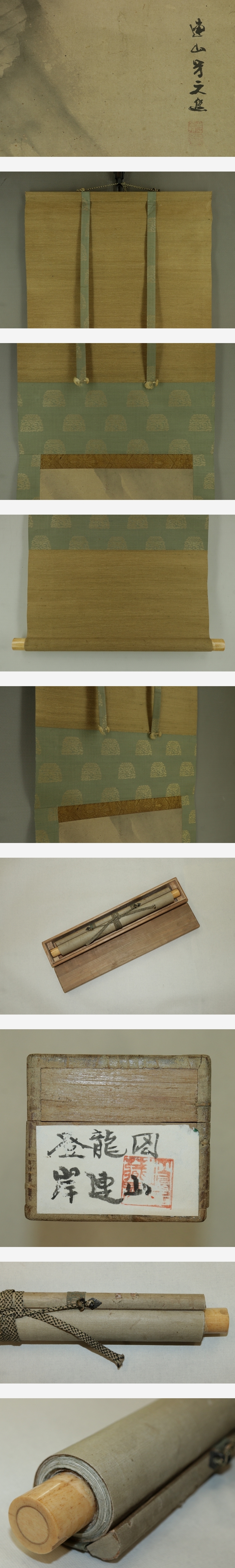 岸連山 きし-れんざん(1804-1859) 江戸時代後期の画家。 文化元年生まれ。京都の人。 岸駒に師事し,養子となって岸派を継ぐ。文政6年有栖川宮家に仕える。 初期の装飾的な画風から、晩年は四条派の温和なものに変わった。 門下に岸竹堂、巨勢小石がいる。 安政6年死去。56歳。本姓は青木。名は昌徳。字は士道、士進。 本紙は、染み、汚れ、強い折れ、皺、虫食い、擦れ、ヤケがあります。 表装は、染み、汚れ、折れ、皺、虫食い、破れ、ほつれ、くすみ、 軸先に汚れと欠けとヒビがあります。 【サイズ】 作品 横約27.5cm×縦約95cm 表装 横約36cm×縦約176cm |