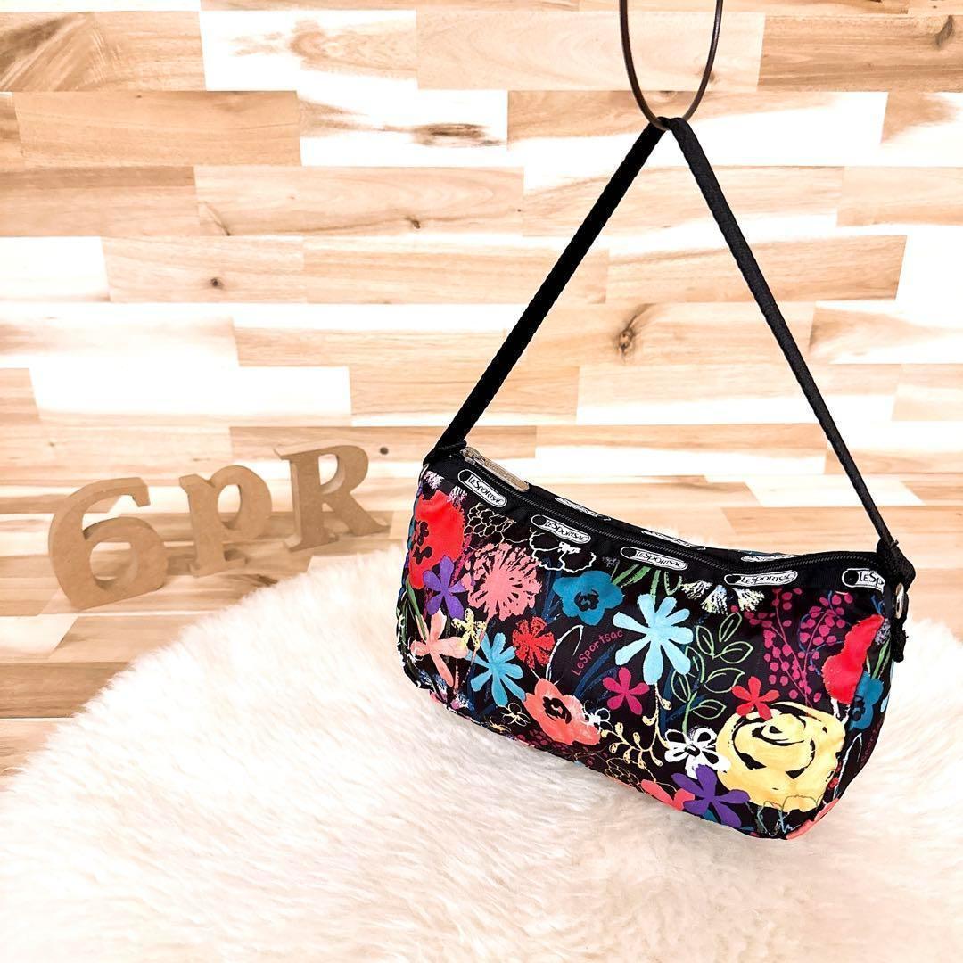 * フローラル *黒地に描かれた鮮やかなフラワープリントが視線を引き寄せ、どの角度から見ても華やかに映える仕上がり。軽やかな素材感で持ちやすく、ほどよいサイズ感が日常使いにも便利で、装いに華やぎを添えてくれるLeSportsacのハンドバッグです。