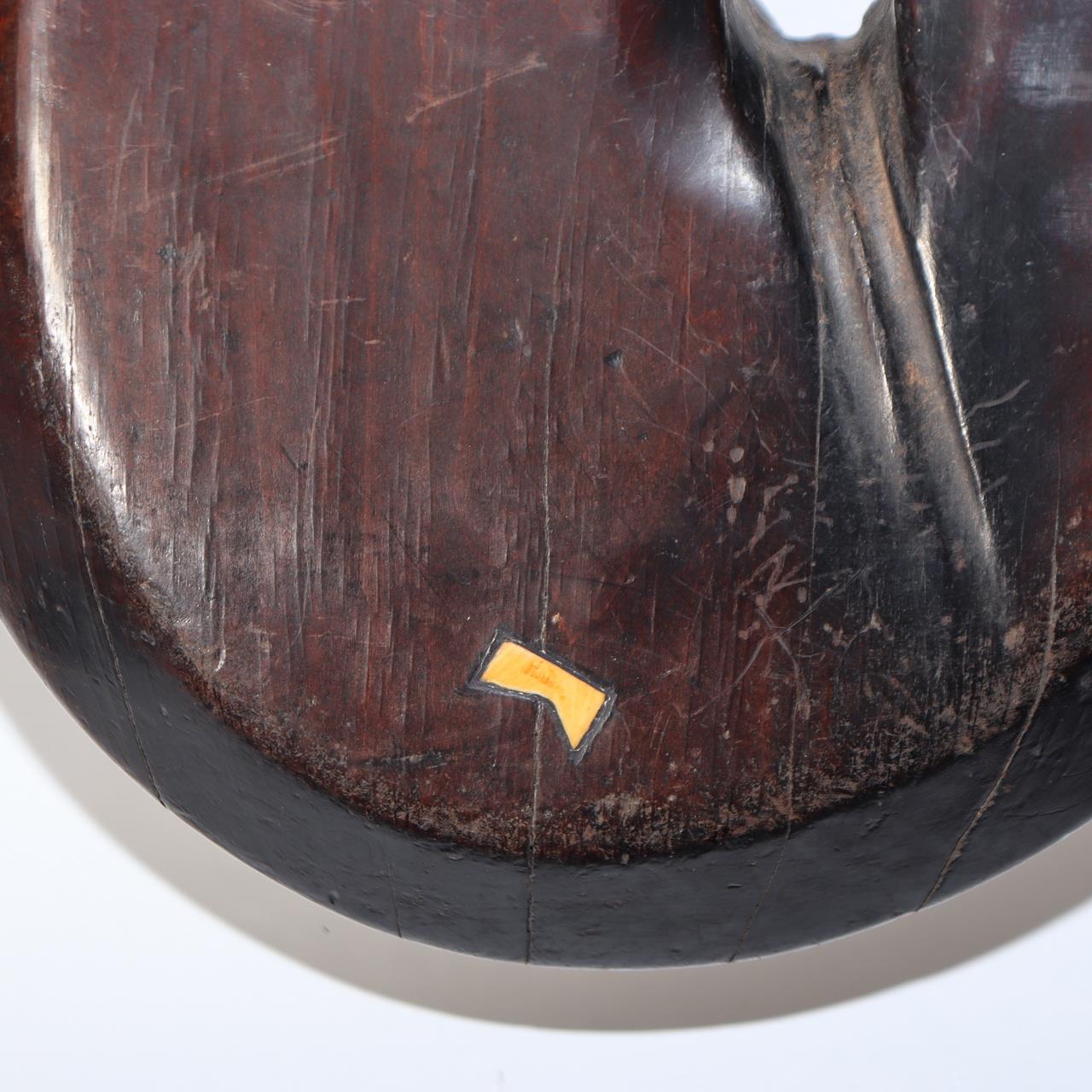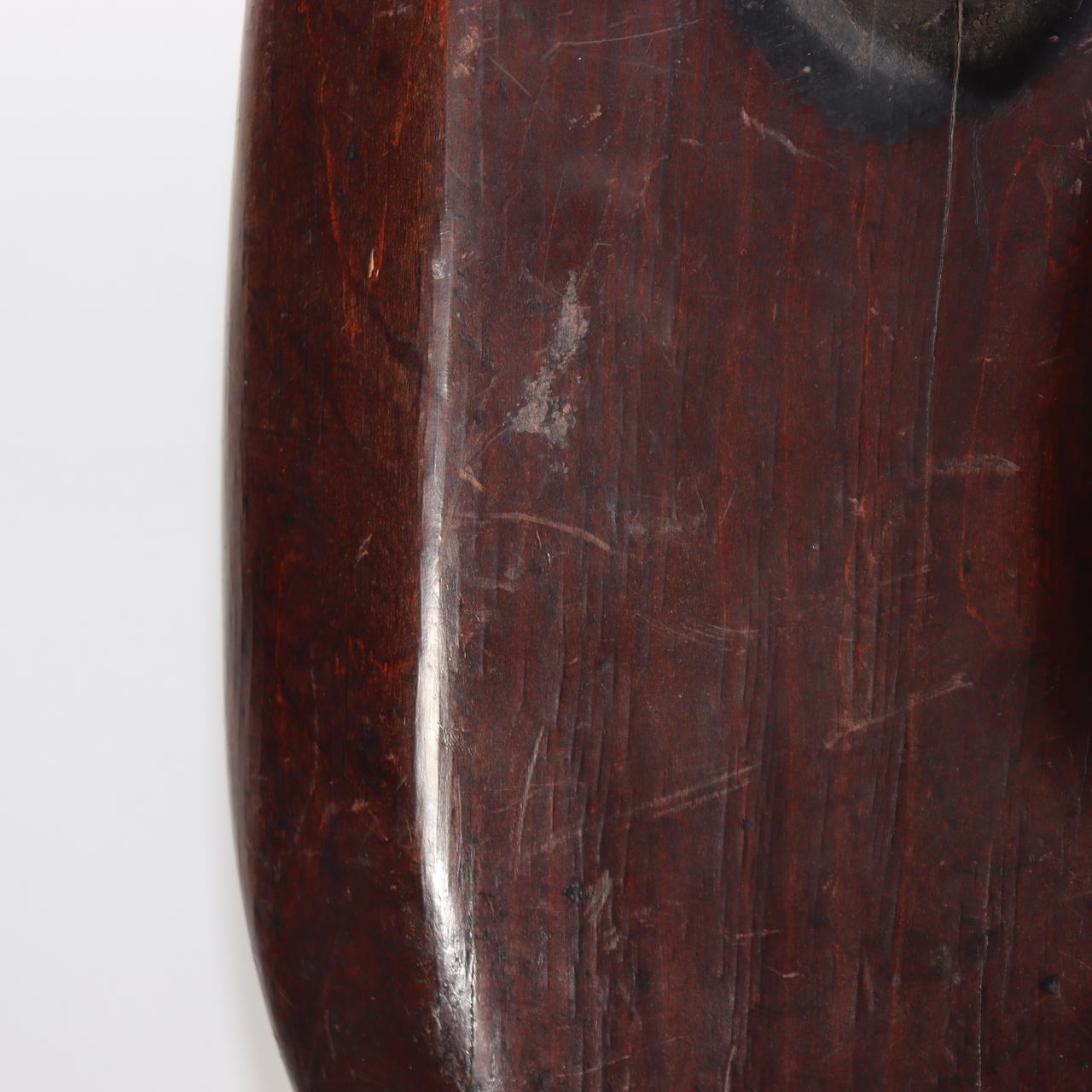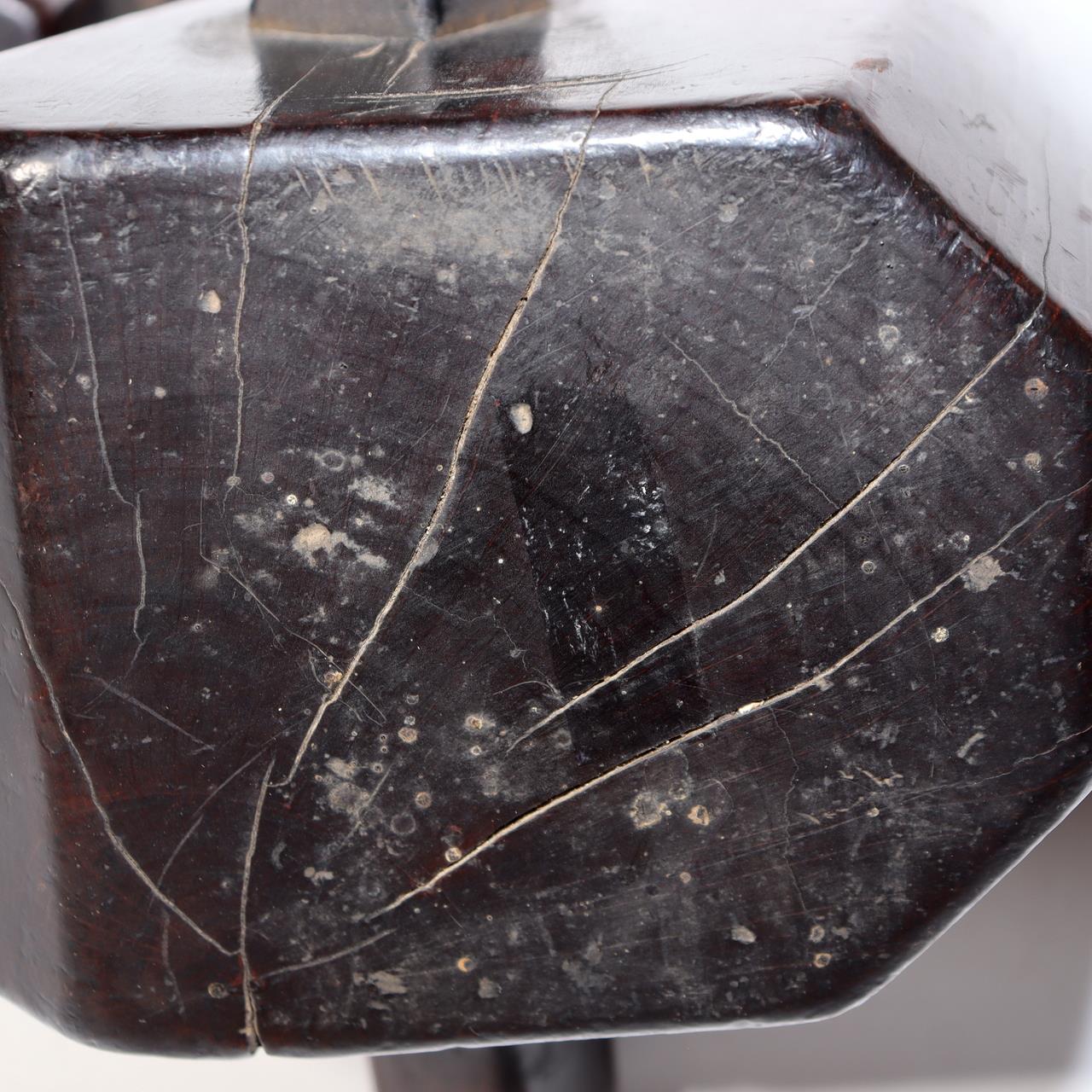 こちらは、時代の 木製空鉤(そらかぎ) です。 表面は長年の囲炉裏使用によって美しく黒光りし、縁は自然に磨耗して滑らかになっています。 さらに、本体には 蝶型の骨象嵌ちぎり補修 が施され、強度を補うと同時に「縁をつなぐ」という精神的な意味合いも込められています。 乾燥によるヒビは見られますが、構造的にはしっかりとしており、 実用品としても、また民芸美術としても大変魅力的な一品です。 【サイズ】 高さ:約32cm(約12.6インチ) 幅:約22cm(約8.7インチ) 奥行:約19cm(約7.5インチ) 重量:約2740g(約6.0lb) 【状態】 経年によるヒビ・摩耗・使用痕が見られます。 ただし、全体は堅牢で安定しています。 当方は骨董品を中心に取り扱っており、安心してお取引いただけるよう丁寧な対応・梱包を心がけております。 ◆ 商品について