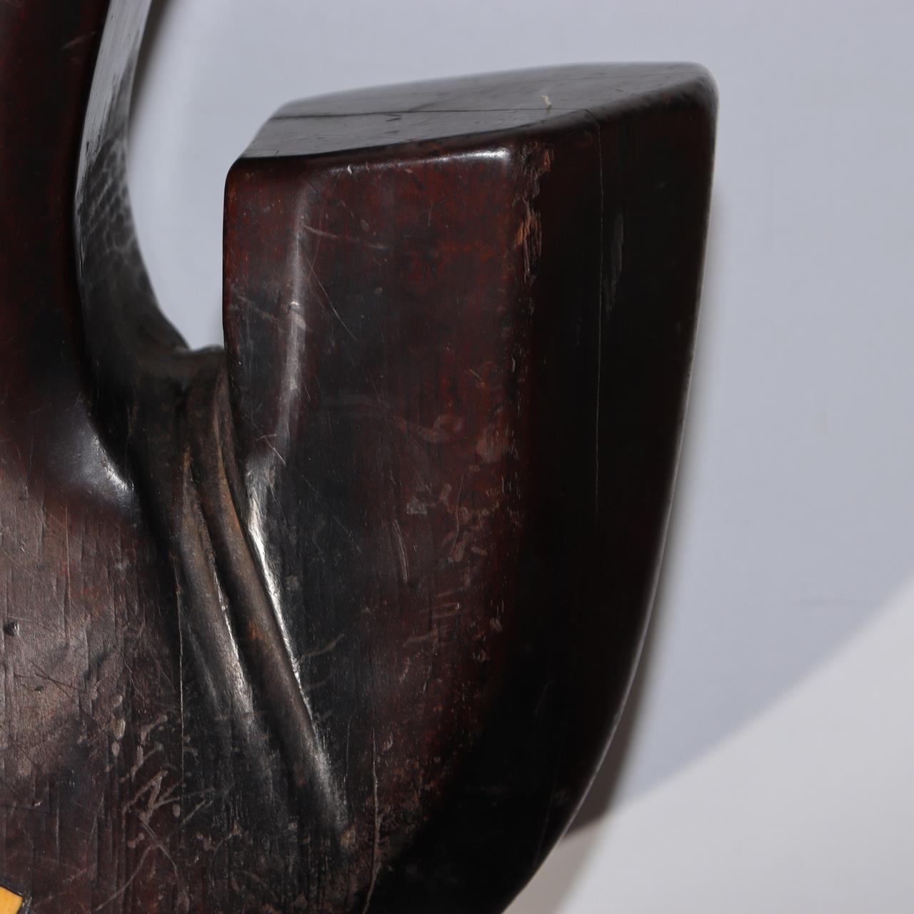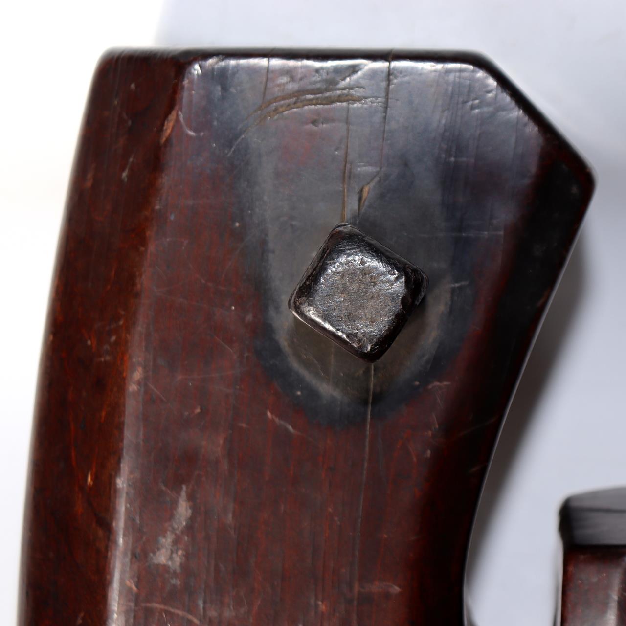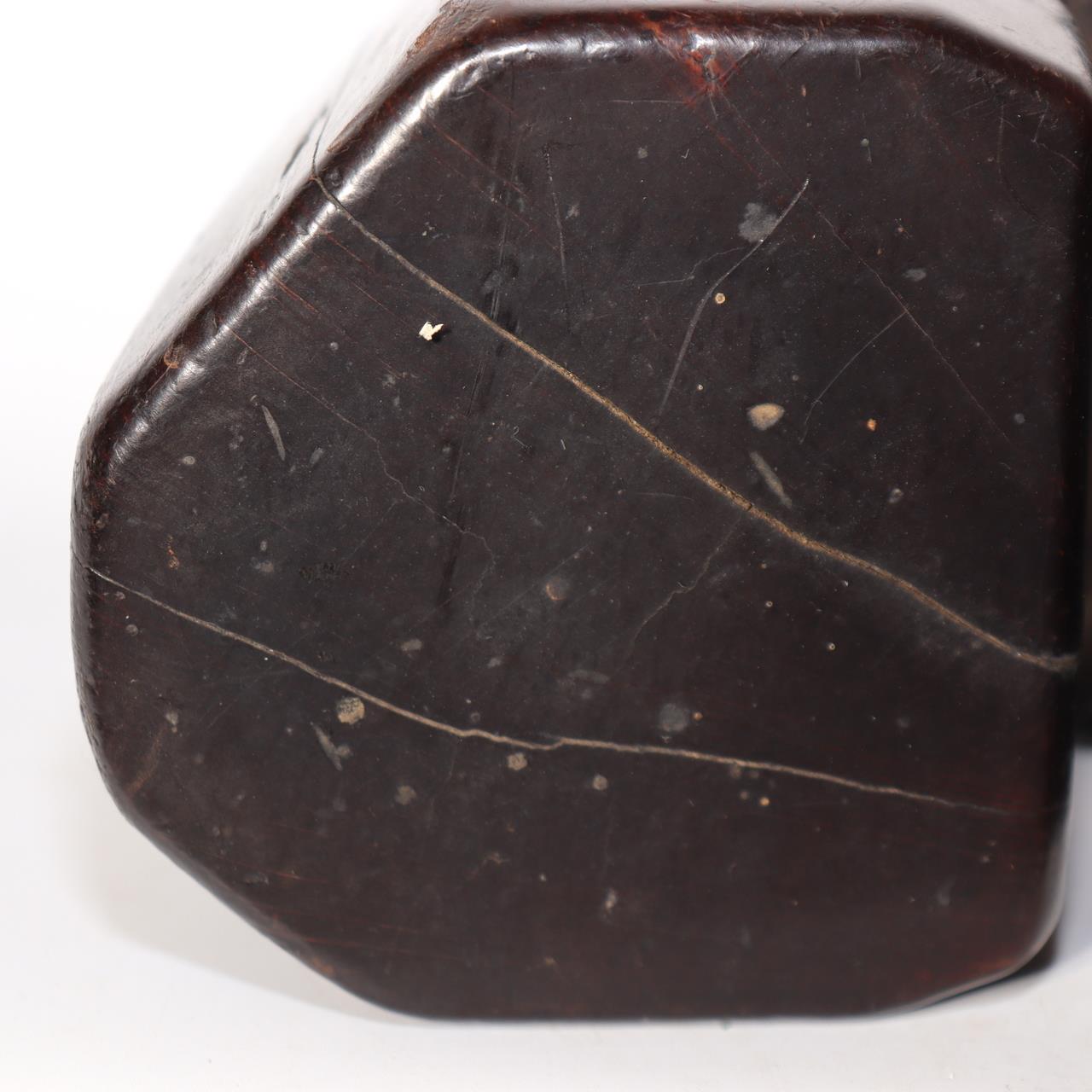 こちらは、時代の 木製空鉤(そらかぎ) です。 表面は長年の囲炉裏使用によって美しく黒光りし、縁は自然に磨耗して滑らかになっています。 さらに、本体には 蝶型の骨象嵌ちぎり補修 が施され、強度を補うと同時に「縁をつなぐ」という精神的な意味合いも込められています。 乾燥によるヒビは見られますが、構造的にはしっかりとしており、 実用品としても、また民芸美術としても大変魅力的な一品です。 【サイズ】 高さ:約32cm(約12.6インチ) 幅:約22cm(約8.7インチ) 奥行:約19cm(約7.5インチ) 重量:約2740g(約6.0lb) 【状態】 経年によるヒビ・摩耗・使用痕が見られます。 ただし、全体は堅牢で安定しています。 当方は骨董品を中心に取り扱っており、安心してお取引いただけるよう丁寧な対応・梱包を心がけております。 ◆ 商品について