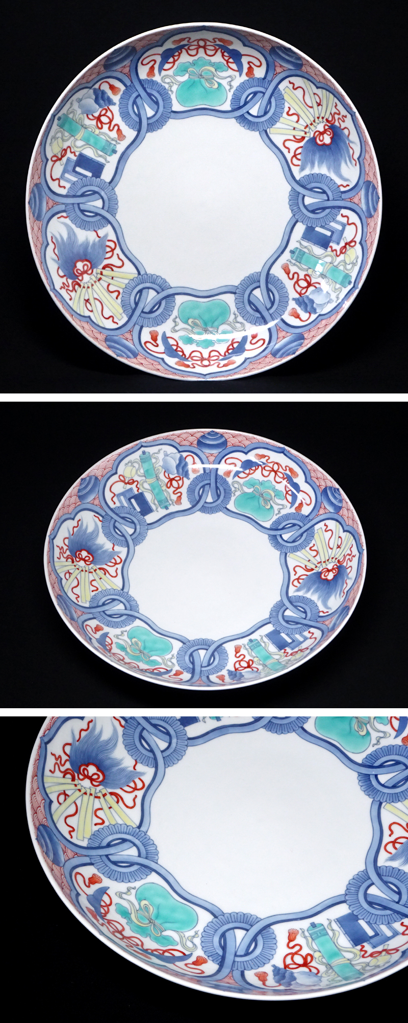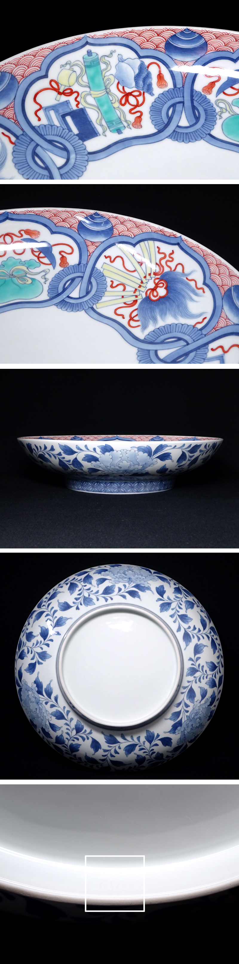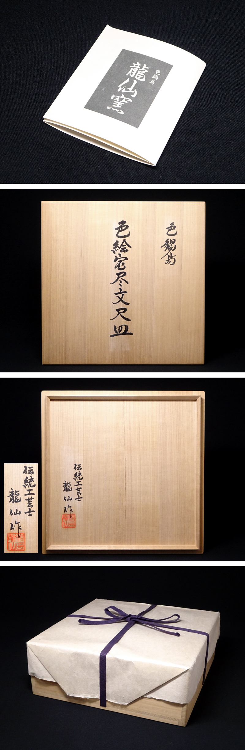 慶應◆伝統工芸士【市川龍男(龍仙)】作 色鍋島 色絵宝尽文尺皿 直径30.5㎝ 共箱付 收藏
