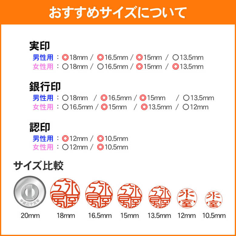 | ■ 彫刻文字 | 姓名(最大8文字)※13.5mm/15mm サイズのみ 姓又は名(最大5文字) ※彫刻文字は屋号、社名、団体名などは個人名以外は彫刻できません。 ※お客様持ち込みの印影(デザイン)では作成は出来ません。 ※文字数が多い場合彫刻出来ない場合がございます。 |