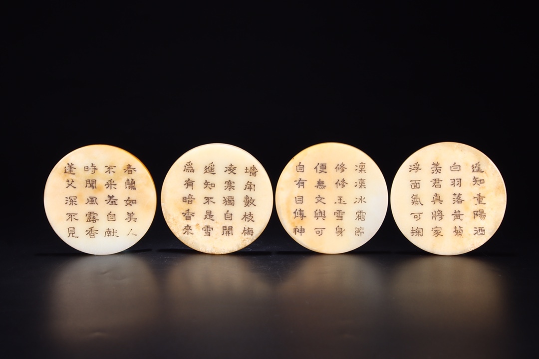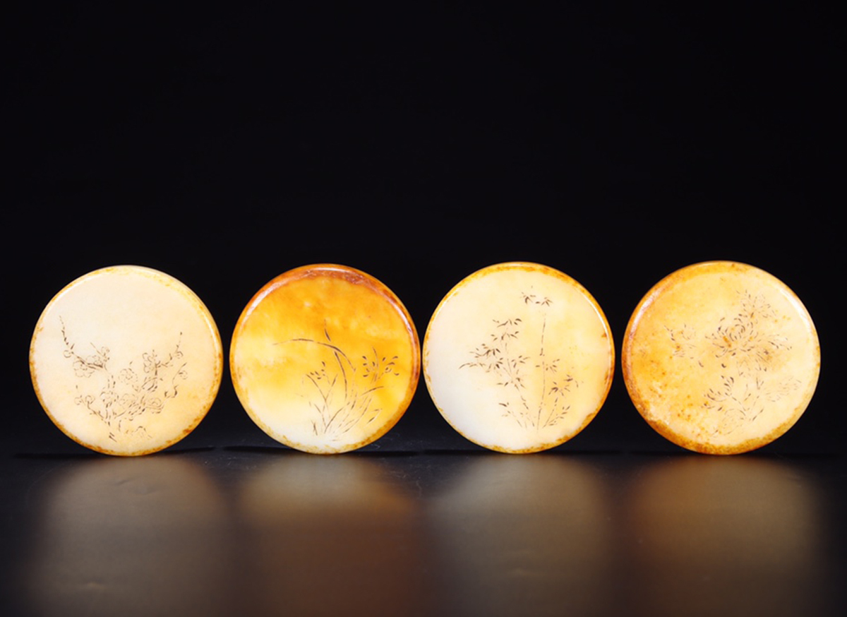 ◆御泓軒◆『清時代 和田玉 梅蘭竹菊紋杯托セット 4点』極細工・古賞物・中国古玩・中国古美術