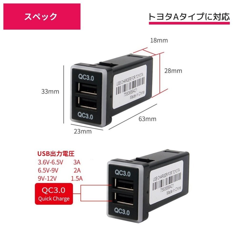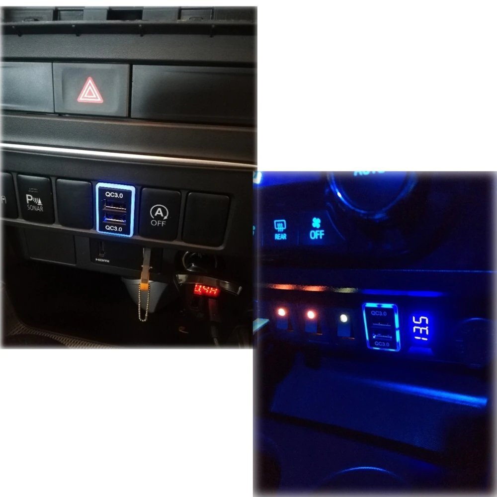 | 自動車・バイクパーツ専門セレクトショップ ※当ストアはTOPSELECTION(id:cars_produce)が管理・運営しております。 デュアルUSBポートスイッチホール QC3.0急速充電対応 3.0×2ポート トヨタ専用カプラー Aタイプ スマホやタブレットの充電が可能な3.0A出力USBポートを2個搭載 急速充電のQC3.0対応で非対応と比べて充電時間を大幅短縮 ブルー発光LEDで夜間の車内イルミネーション効果もばっちり 【特徴】 ● トヨタ専用カプラー Aタイプ ● LED発光:ブルー (青) ● 過電流防止ヒューズ付き ● スイッチパネルと交換するだけなので純正風な自然な仕上がり 【取付方法】 車両側シガーソケット裏側にあるカプラーを引き抜き付属ハーネスを割り込ませるだけ! カプラーオン取付のため純正配線を傷つけません。※1 ※1シガーソケットカプラーが適合しない場合はカプラーオンでの取付はできません。 その場合はカプラーは使用せず手前でカットしエレクトロタップ等を使用して赤線をACC線、黒線をアース線にそれぞれ接続する必要があります。 ※また車種によってハーネスの長さが足りない場合があります。その場合は延長作業が必要です。 ※タイトル記載の車種はスイッチ本体の適合車種です。 写真と同じトヨタ純正シガーソケットではない場合は付属ハーネスを使用したカプラーオン取付はできません。 【仕様】 ・入力電圧:DC9~24V ・出力電圧:5V ・最大出力 2ポート合計6A ・サイズ:縦 33mm×横23mm ハーネス約120cm (高さ33mm×幅22.5mmの空きスイッチパネルに適合) |