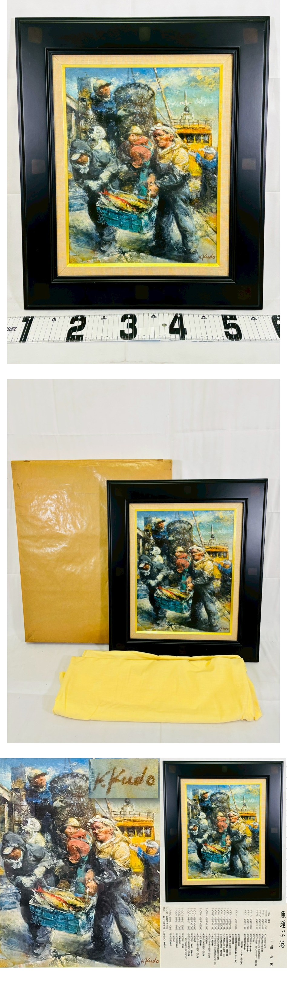 【真作】工藤和男「魚運ぶ港」油彩画 額装 漁師 肉筆 直筆 人物画 創元会会長 日展評議員 力強い筆致の傑作 絵画 大御所作家 インテリア 收藏