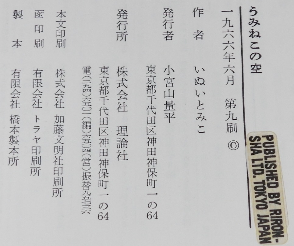 ジュニア・ライブラリー うみねこの空 いぬいとみこ 理論社 1966年6月第9刷 A5判ハードカバー.