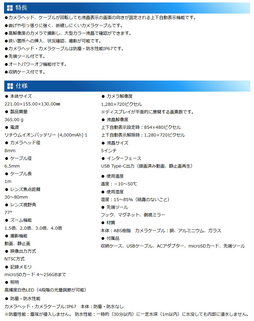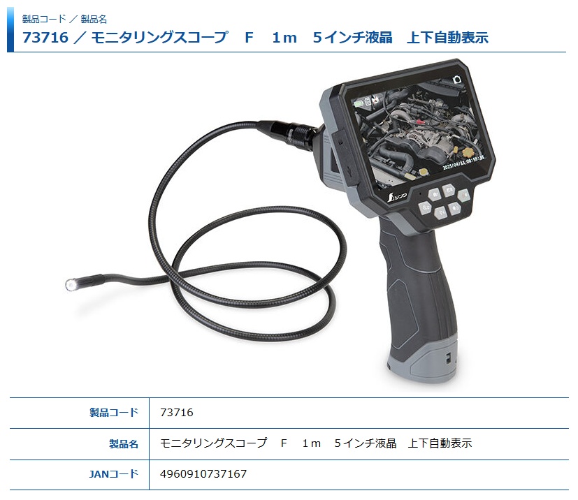シンワ測定 モニタリングスコープ F 1m 5インチ液晶 上下自動表示73716■特長・カメラヘッド、ケーブルが回転しても液晶表示の画面の向きが固定される上下自動表示機能です。・曲げや引っ張りに強く、断線しにくいカメラケーブルです。・高解像度のカメラで撮影し、大型カラー液晶で確認ができます。・狭い箇所への挿入、状況確認、撮影が可能です。・カメラヘッド・カメラケーブルは防塵・防水性能IP67です。・先端ツール付です。・オートパワーオフ機能付です。・収納ケース付です。