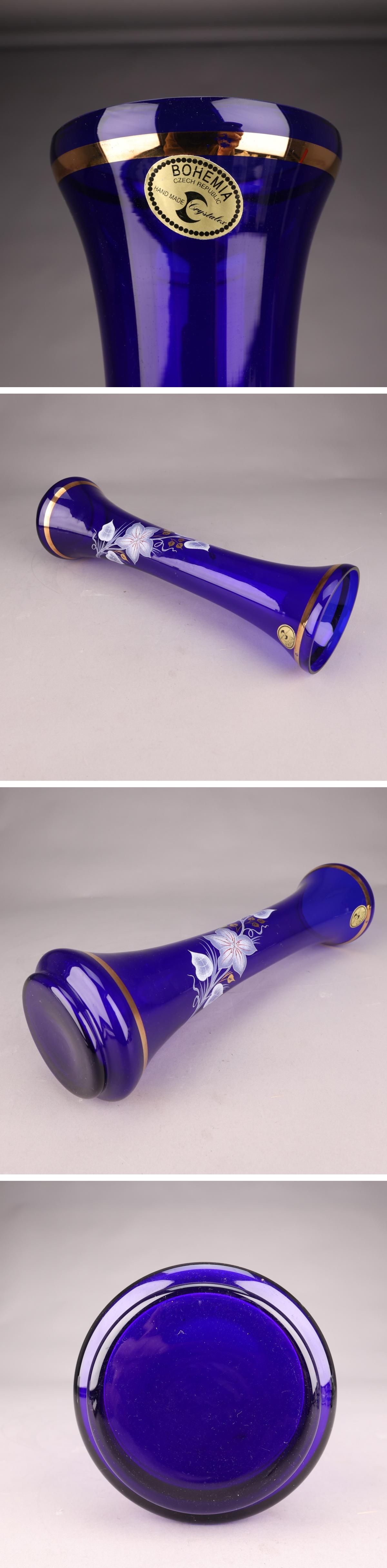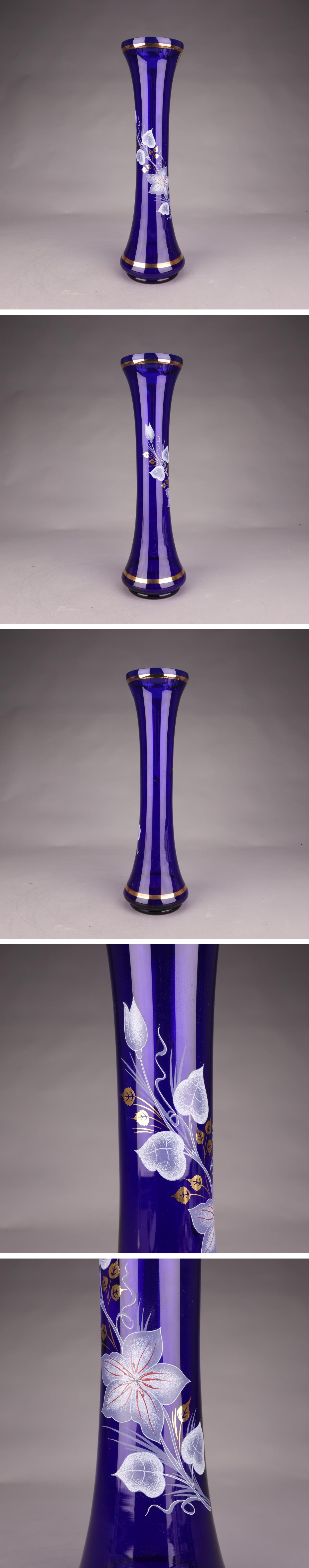 【志】A1386ガラス花瓶 ボヘミアガラス BOHEMIA GLASS 金彩×草花 ブルー 高さ40cm 華道具 收藏