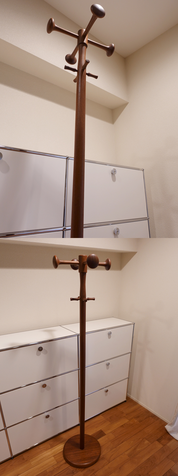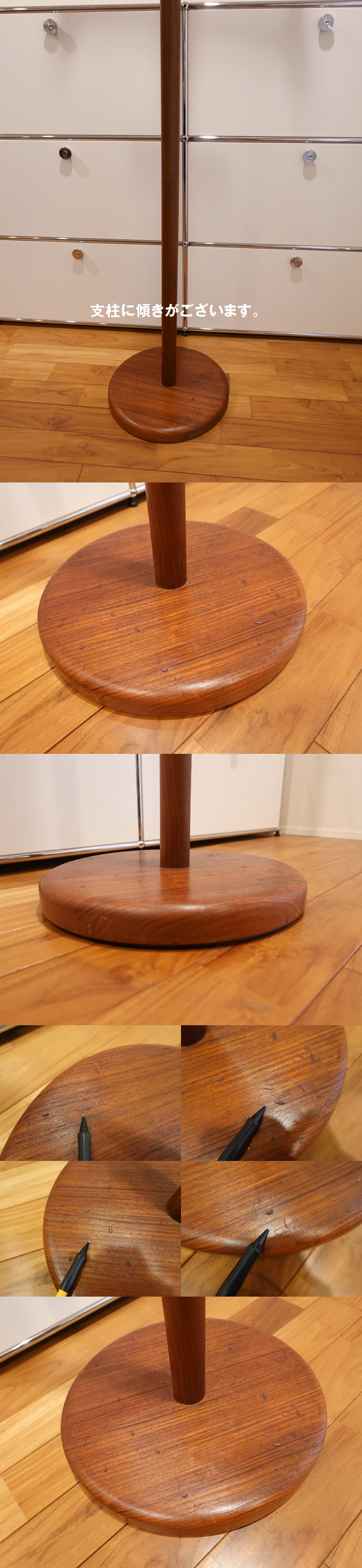 ご覧いただきましてありがとうございます。 おそらく、1980年代ごろの国産品と思われる、チーク製のコートスタンドです。 古き良き時代の製品で、造りはたいへんしっかりとしたもので、見た目以上の重量がございます。 コンディションは良好ですが、支柱に「傾き」が出ています。説明文をよくご確認ください。 全高は170cm程度です。 コンディションですが、中古の状態で入手をした古いものですので、年相応の使用感がございます。大きな破損や目立つキズはございませんが、主に台座部分に打痕が散在しています。 ハンガー先端部分はきれいな状態です。 支柱に「傾き」が出ています。おそらく、台座との接合部で発生しているものと思われますが、支柱と台座が一体構造になっておりますため、調整ができませんでした。 傾きは、本体を見る方向によって変わります。いちばん目立つ角度で見ますと、やや気になるかと思います。 傾きの調整用に、台座裏に貼り付ける市販のフェルト製クッション材をお付けいたします。フェルトを貼りますと、傾きはあまり気にならなくなりました。フェルトの厚みはおよそ5mmで、台座が少し浮きますが、台座の重量があるため、ぐらつきなどは出ません。 入荷後、木製品オイルでメンテナンスをしております。 北欧家具などとの相性もよく、古い製品ならではの「味」がございます。 中古品はなかなか出ませんので、この機会にいかがでしょうか。 |