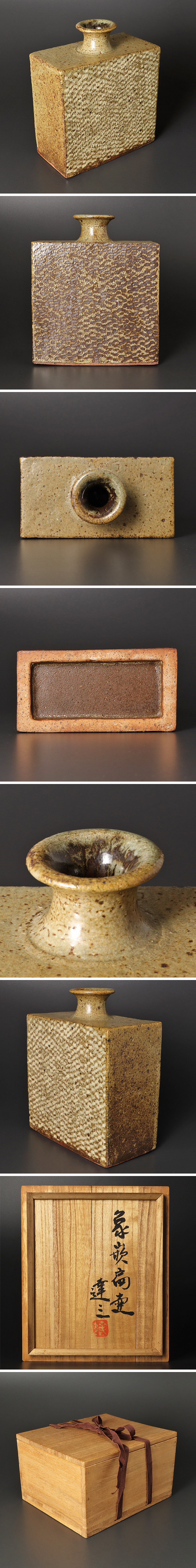 人間国宝・島岡達三氏の真骨頂ともいえる、民藝の精神と類まれな技法が凝縮された「象嵌扁壷(ぞうがんへんこ)」でございます。 島岡達三氏は、師である濱田庄司氏から受け継いだ民藝の教えを礎に、独自の「縄文象嵌(じょうもんぞうがん)」を確立し、重要無形文化財保持者としてその名を世界に刻んだ巨匠です。本作においても、氏を象徴する縄文象嵌の技法が遺憾なく発揮されており、器面に施された精緻な紋様は、まるで古代の息吹を現代に呼び起こすかのような、素朴ながらも圧倒的な生命力を放っています。 扁壷という独特の造形は、見る角度によって豊かな表情の変化を楽しませてくれます。ゆったりとした膨らみを持つ胴に、計算し尽くされた縄目の紋様、そしてその溝に埋め込まれた化粧土が織りなすコントラストは、まさに工芸美の極致です。さらに、島岡氏が得意とした塩釉(しおぐい)や地釉が炎の洗礼を受けて生まれた渋みのある発色は、一点として同じもののない深い味わいを作品に与えています。 無機質な土が、名工の情熱と炎の力によって、凛とした品格と温かみを併せ持つ芸術品へと昇華されています。花を活ければその美しさを一層引き立て、そのまま置いても空間の主役となる風格を備えています。 共箱には、島岡達三氏自らの確かな墨跡による題字と落款が記されており、その一品に込められた誇りを物語っています。民藝の伝統美を追求し続けた人間国宝の魂を、ぜひお手元で末永くご愛用ください。 ★商品は島岡達三の作品である事を保証致します。 |