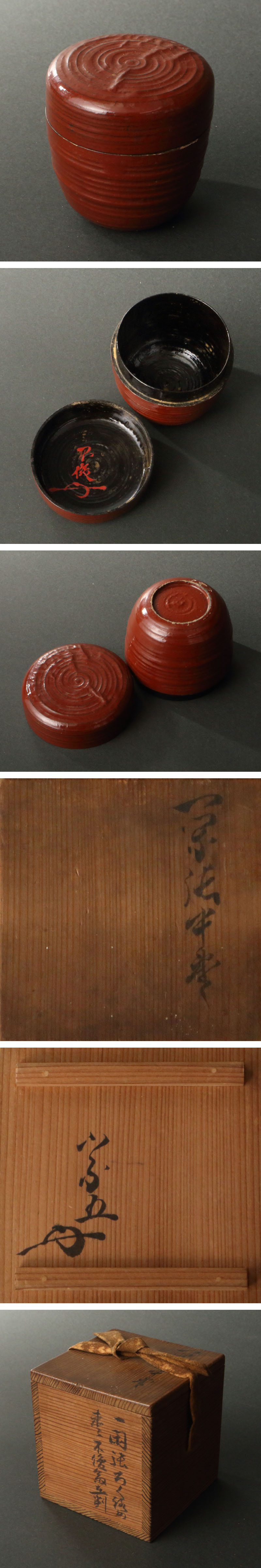 【深和】江戸後期◆一閑張溜轆轤目中棗 松尾不俊斎書付(茶道具 薄茶器 松尾流 紙胎漆器 張貫棗 漆芸 宗匠 名古屋) 收藏
