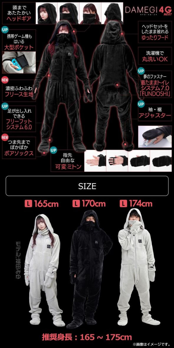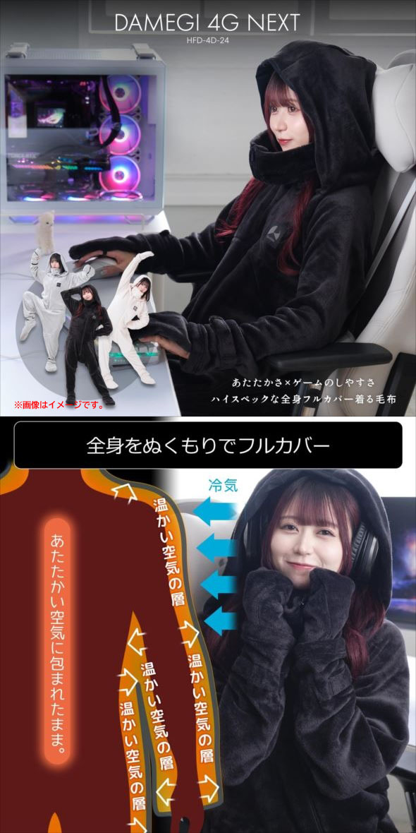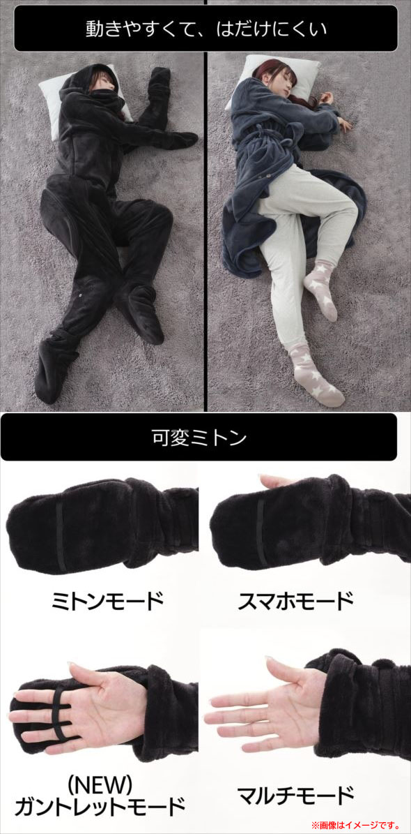 【商品特長】 ◆全身をぬくもりでフルカバー 頭のてっぺんから指先・つま先まで、全身をぬくもりで包み込む着る毛布です。 濃密ふかふかのベロアフリース生地と、内部に体熱を密閉する人型デザインが、 温かい空気の層をつくって全身を冷気から徹底カバーします。 ◆動きやすくて、はだけにくい 部屋着として快適にストレスなく着用できる、締め付けの少ないゆったり設計を採用。 ラグラン&サルエル構造で肩周り・股には充分なゆとりを確保し、四肢の動きを制限しないよう配慮しています。 どれだけ動いても・寝返りをうってもはだけない、機動性に優れた着る毛布です。 ◆【UP】 可変ミトン PCゲーム、TVゲーム、スマホゲーム・・・あらゆるゲームで必要とされる"指先の緻密な動き"。 マウスやコントローラーを握る手が冷えて動かしづらい…と悩むゲーマーのため、 ゲームスタイルに合わせて手指の露出度を調整できる、独自の手袋システム「可変ミトン」を搭載しています。 | |||||||||||||