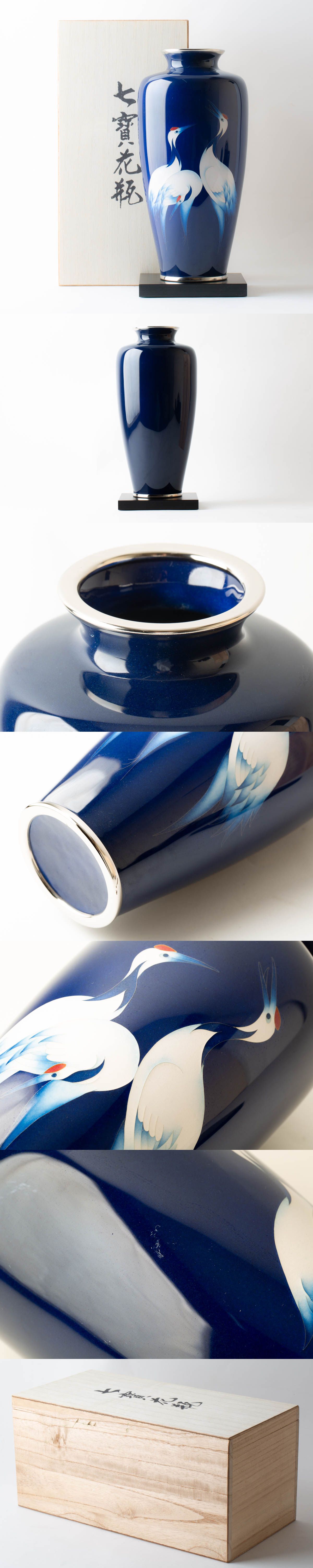 七宝焼 七寳花瓶 鶴 紺地 花生 花入 飾壺 花器 華道具 茶道具 木箱付 #39396 收藏