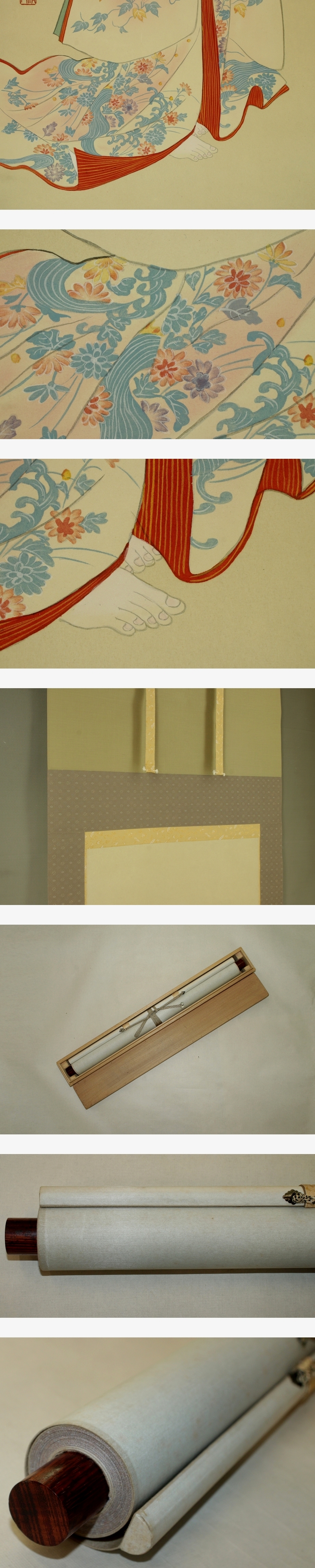 鏑木清方 かぶらき-きよかた(1878-1972) 明治-昭和時代の日本画家。 明治11年8月31日生まれ。条野採菊の子。水野年方に師事。 明治35年「一葉女史の墓」で注目される。 以後,浮世絵の伝統を生かした作品を発表。 文展で活躍し,帝展審査員となる。昭和12年芸術院会員。29年文化勲章。 昭和47年3月2日死去。93歳。東京出身。本名は健一。 作品はほかに「築地明石町」など。著作に「こしかたの記」。 本紙は、軽い染みがあります。 表装は、軽い染み、軽い皺があります。 【サイズ】 作品 横約42cm×縦約105cm 表装 横約56cm×縦約186cm |