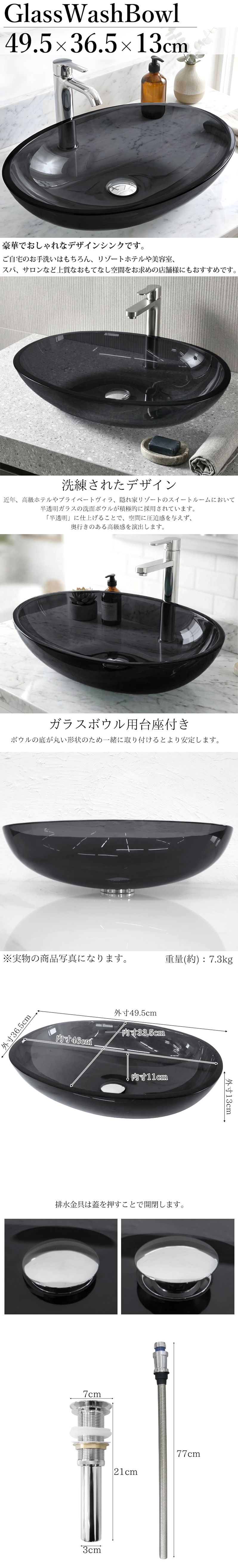 1円 洗面ボウル おしゃれ 495×365mm スモークガラス 大理石天板 強化ガラス 透明 洗面台 ガラスボウル用台座付き 排水ホース付き WB-66SBK 收藏