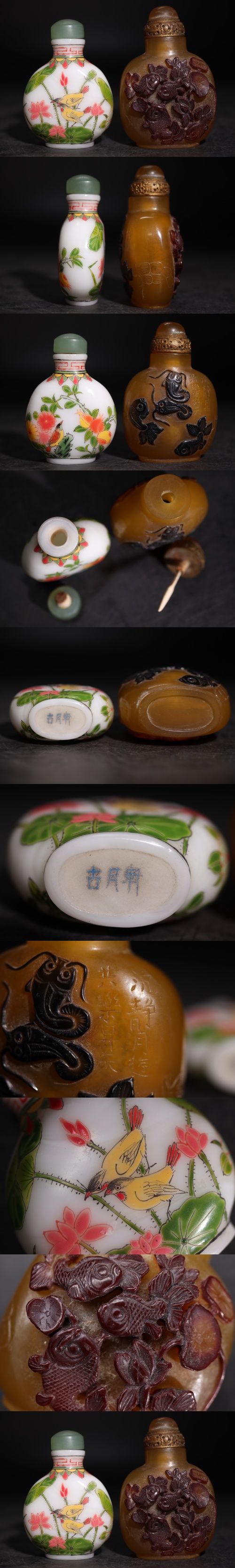 古月軒 底款 色絵 花鳥文 ・ 魚文 鼻煙壺 二点 / 中国美術 煎茶道具 煎茶飾 検索: 乾隆ガラス .G4117 收藏