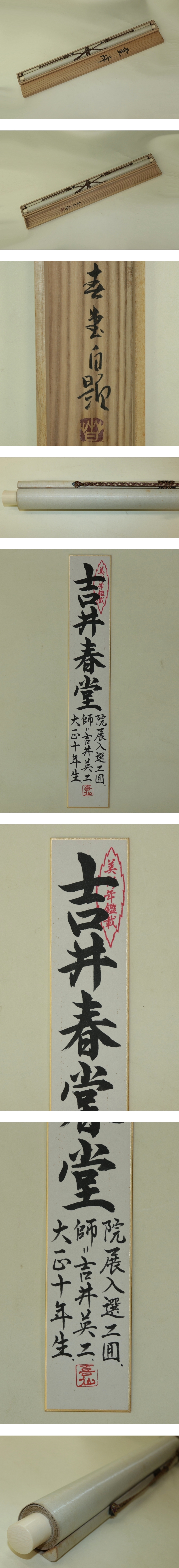 吉井春堂 大正10年東京都に生。帝美卒。振興展、院展2、、グループ展。無所属。 本紙は、染みがあります。 表装は、染み、軽い皺があります。 【サイズ】 作品 横約70cm×縦約59cm 表装 横約89cm×縦約157cm |