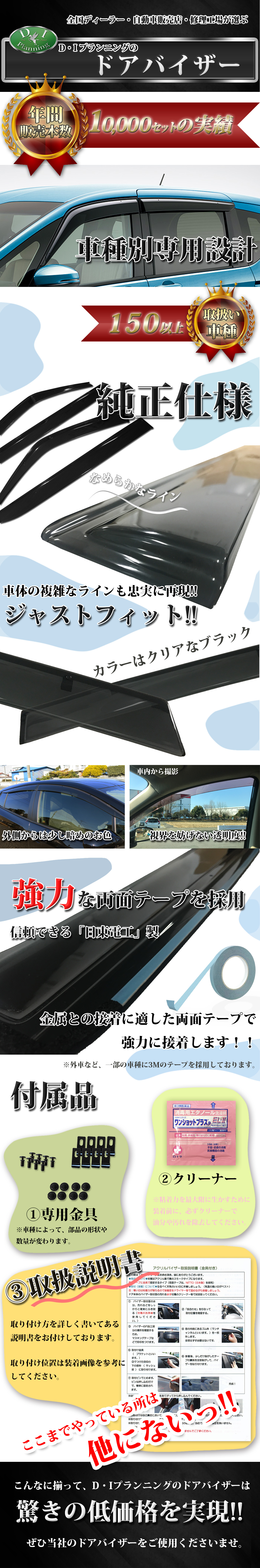 | ■バイザー付属品 | ・専用金具 ※車種によって金具の形状・個数は異なります。 ・取付説明書 ※取り付けなど、ご不明な点がございましたらお気軽にご連絡ください。 ・専用クリーナー |