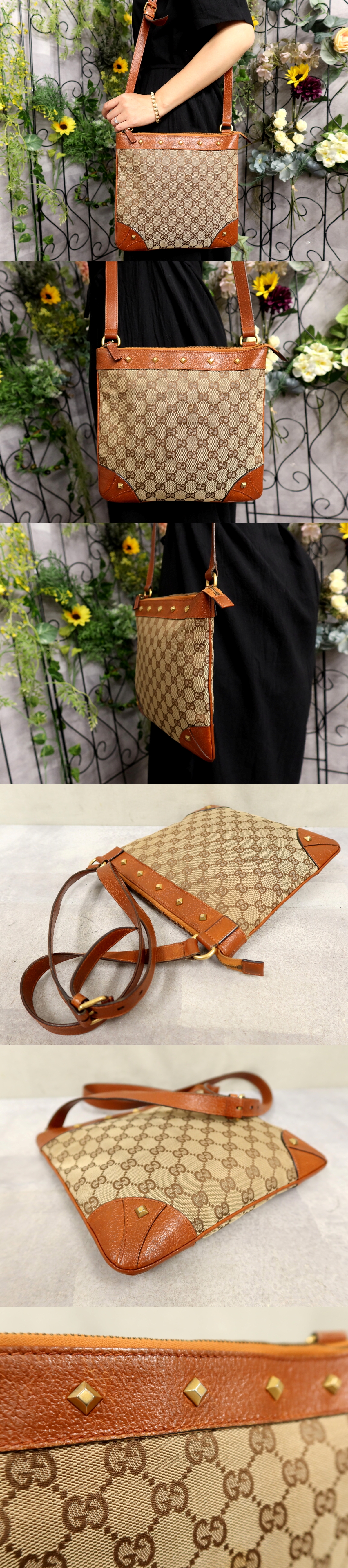 ●美品●GUCCI グッチ●スタッズ●GGキャンバス カーフ レザー 本革●ショルダー バッグ●ブラウン系●ゴールド金具●イタリア製●Js58089 收藏