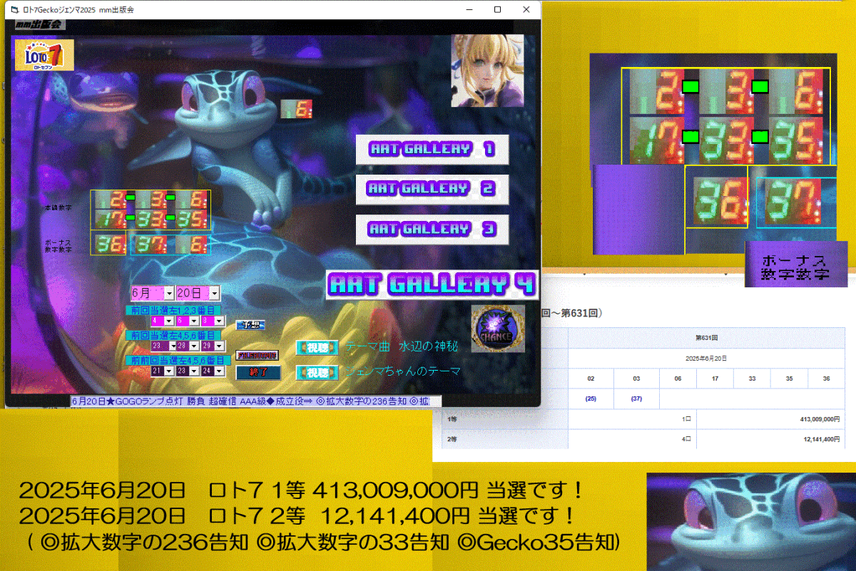 2025年6月20日 ロト7 2等  12,141,400円  ( ◎拡大数字の236告知 ◎拡大数字の33告知 ◎Gecko35告知)当選です!