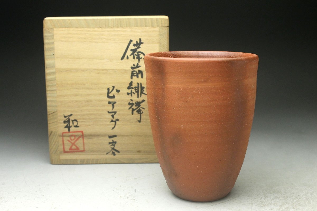 【余韻】 備前焼 藤原和 緋襷 ビアマグ★共箱 無傷美品 茶道具<同梱可> 收藏