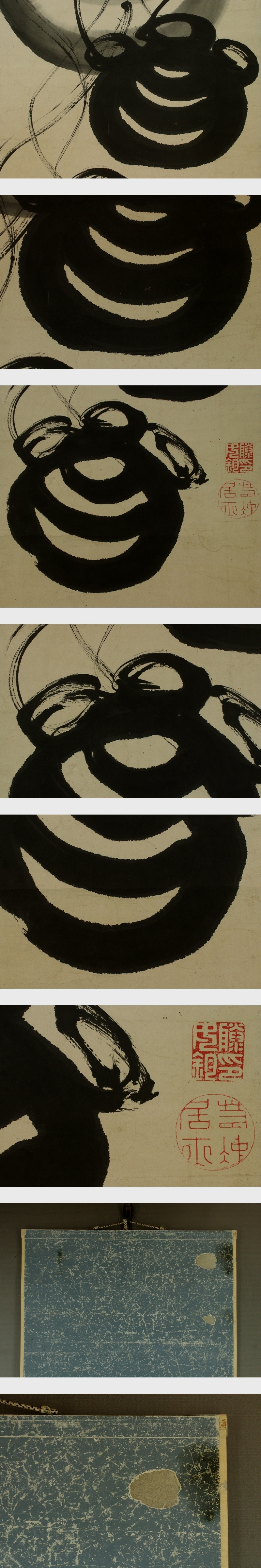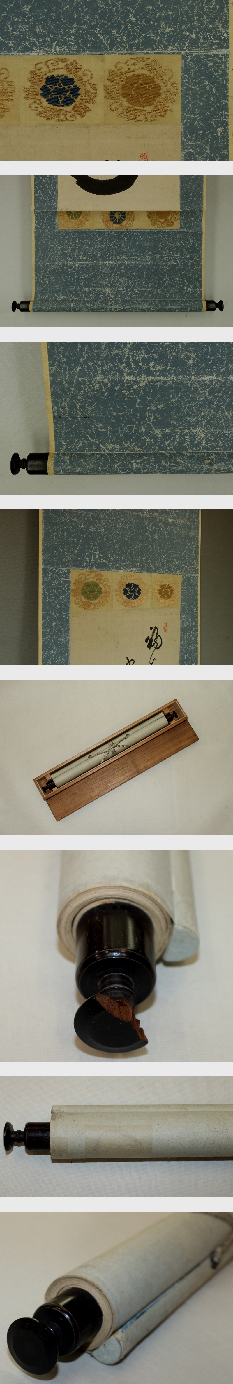 伊藤若冲 いとう-じゃくちゅう(1716-1800) 江戸時代中期-後期の画家。 正徳6年2月8日生まれ。はじめ狩野派を学ぶ。 宋,元,明の中国画や尾形光琳の画風を研究し,写実性を基調に装飾性を加えた独自の境地を開く。 花鳥画,特に鶏図を得意とした。寛政12年9月10日死去。85歳。京都出身。 名は春教,汝鈞(じょきん)。字は景和。別号に斗米庵。 本紙は、染み、汚れ、強い折れ、皺、虫食い、破れ、擦れ、ヤケがあります。 表装は、染み、汚れ、強い折れ、皺、虫食い、破れ、ほつれ、擦れ、ヤケ、修理痕、剥れ、 軸先に汚れ、割れ、欠けがあり、巻紐が短いです。 【サイズ】 作品 横約29.5cm×縦約112.5cm 表装 横約42.5cm×縦約181cm |