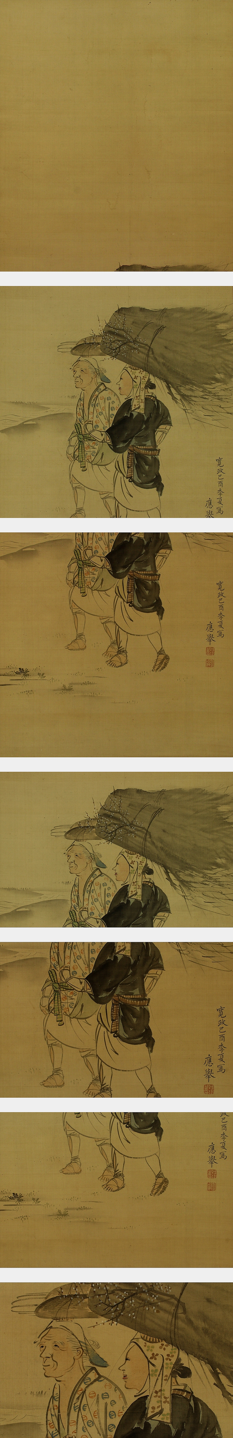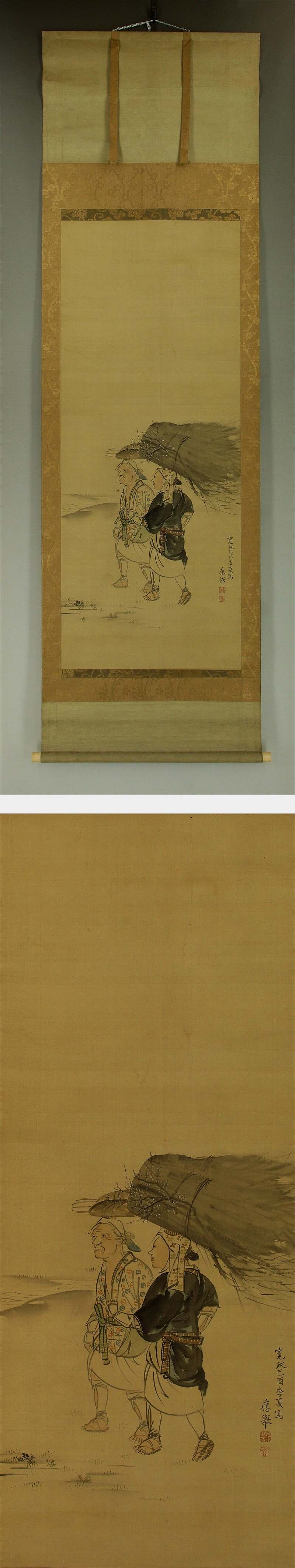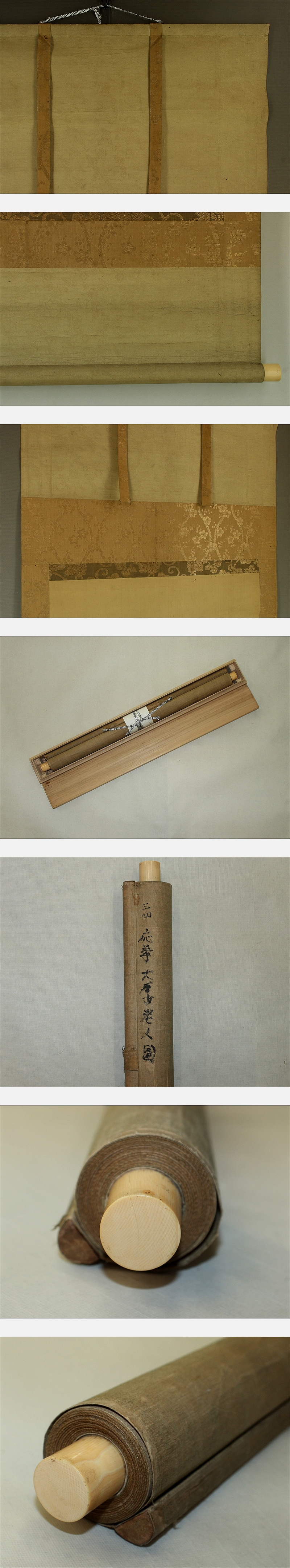 円山応挙 まるやま-おうきょ(1733-1795) 江戸後期の画家。円山派の祖。丹波生。 字は僊斎・仲選、号は一嘯・夏雲・仙嶺等、通称は主水。 石田幽汀に狩野派の画法を学び、幽汀の写生的画法に、宋・元画の技法を取り入れると共に、 西洋画の遠近法を研究して一家を成した。動植物の写生を最も能くする。 寛政7年(1795)歿、63才。 本紙は、染み、汚れ、折れ、皺、浮き、ヤケがあります。 表装は、染み、汚れ、折れ、皺、虫食、破れ、ほつれ、くすみ、ヤケ、軸先に汚れと傷みがあります。 【サイズ】 作品 横約48cm×縦約122cm 表装 横約59cm×縦約197cm |