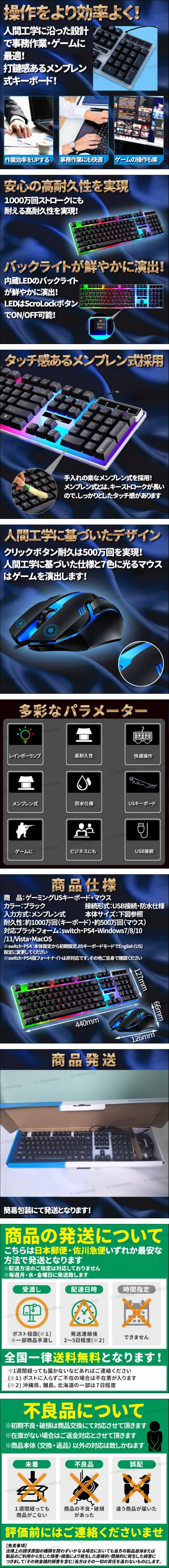 ご覧頂きありがとうございます! ゲーミング US配列キーボード・マウスセットの紹介です! 安くでカッコいいゲーミングキーボード・マウスなら、これで決まり! 特徴は、キーボード1000万回・マウス500万回ストロークにも耐える高耐久性! 鮮やかに光る7色LEDバックライト仕様でゲームにも最適! また、US配列で余計な日本語表記がないためキーボード入力になれている方であればシンプルに見やすい仕様になっております! マウスも人間工学にもとづいたデザインで疲れにくい仕様です | ||