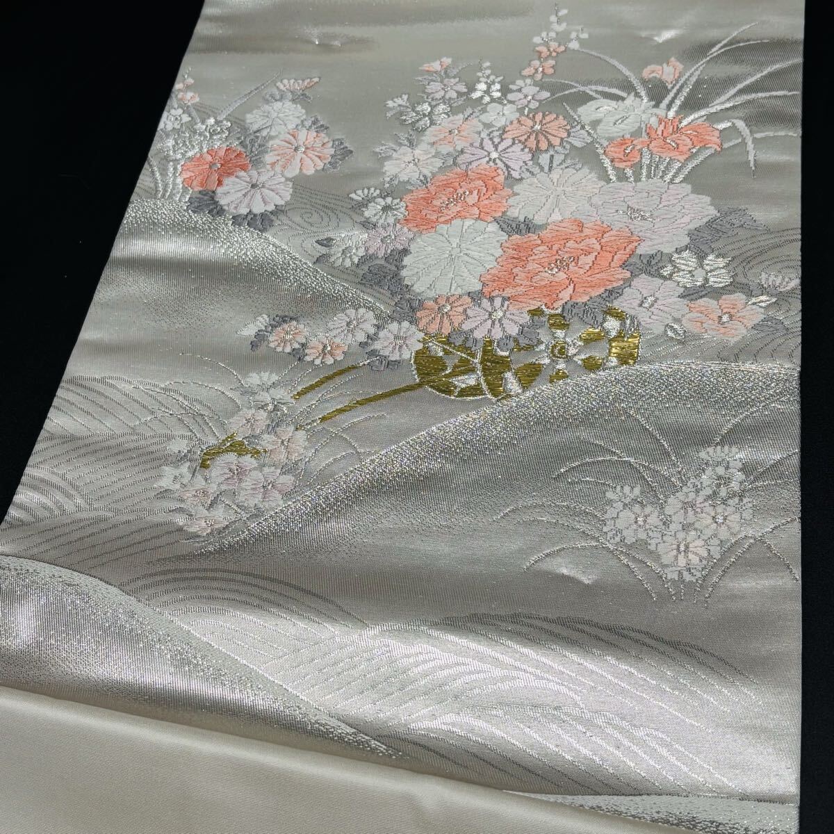 ホワイトシルバー地に淡い花車のデザインが上品な名古屋帯です。