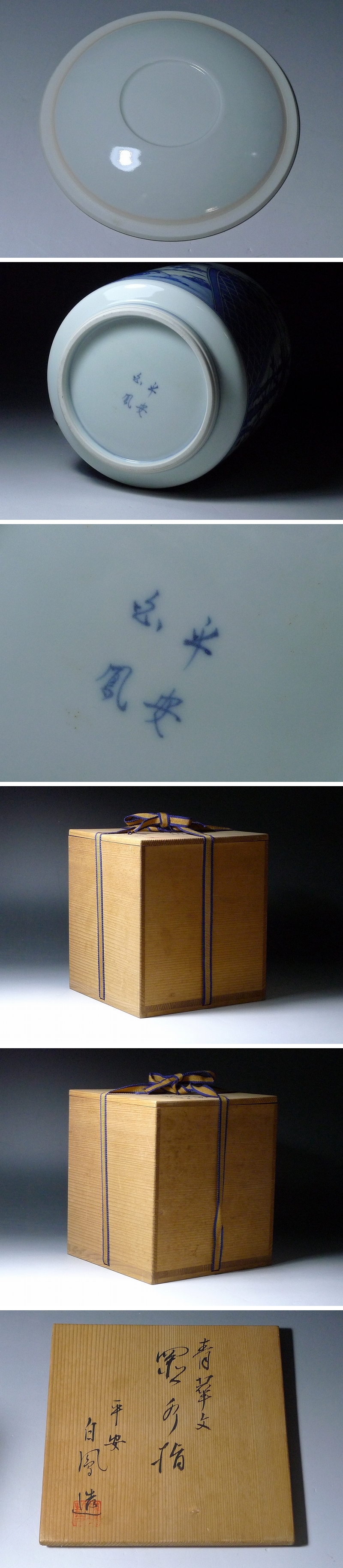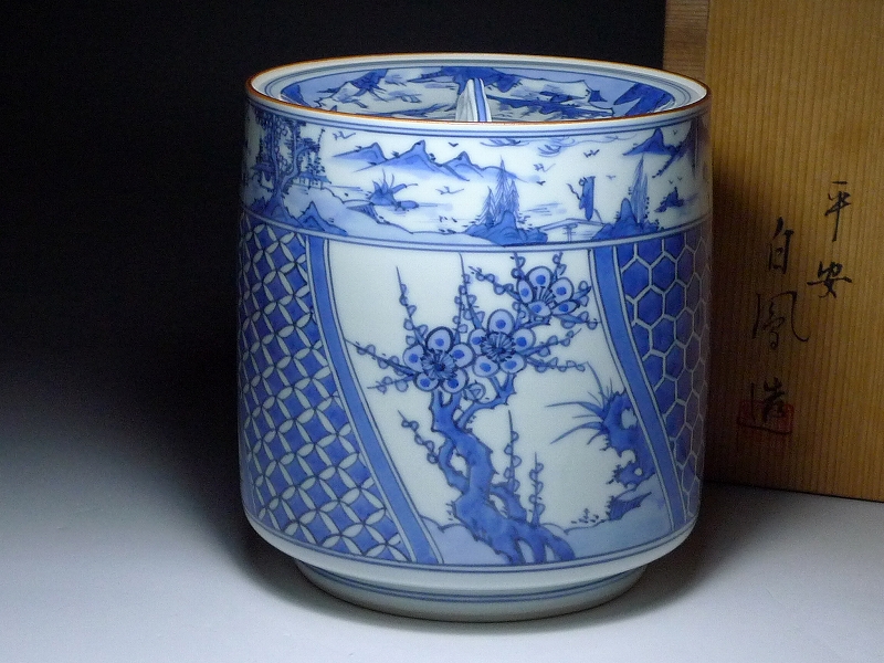 10HT171★茶道具 京焼 平安白鳳造 染付山水楼閣松竹梅文水指 青華文 清水焼 水器 水差 水瓶 陶器 工芸 收藏