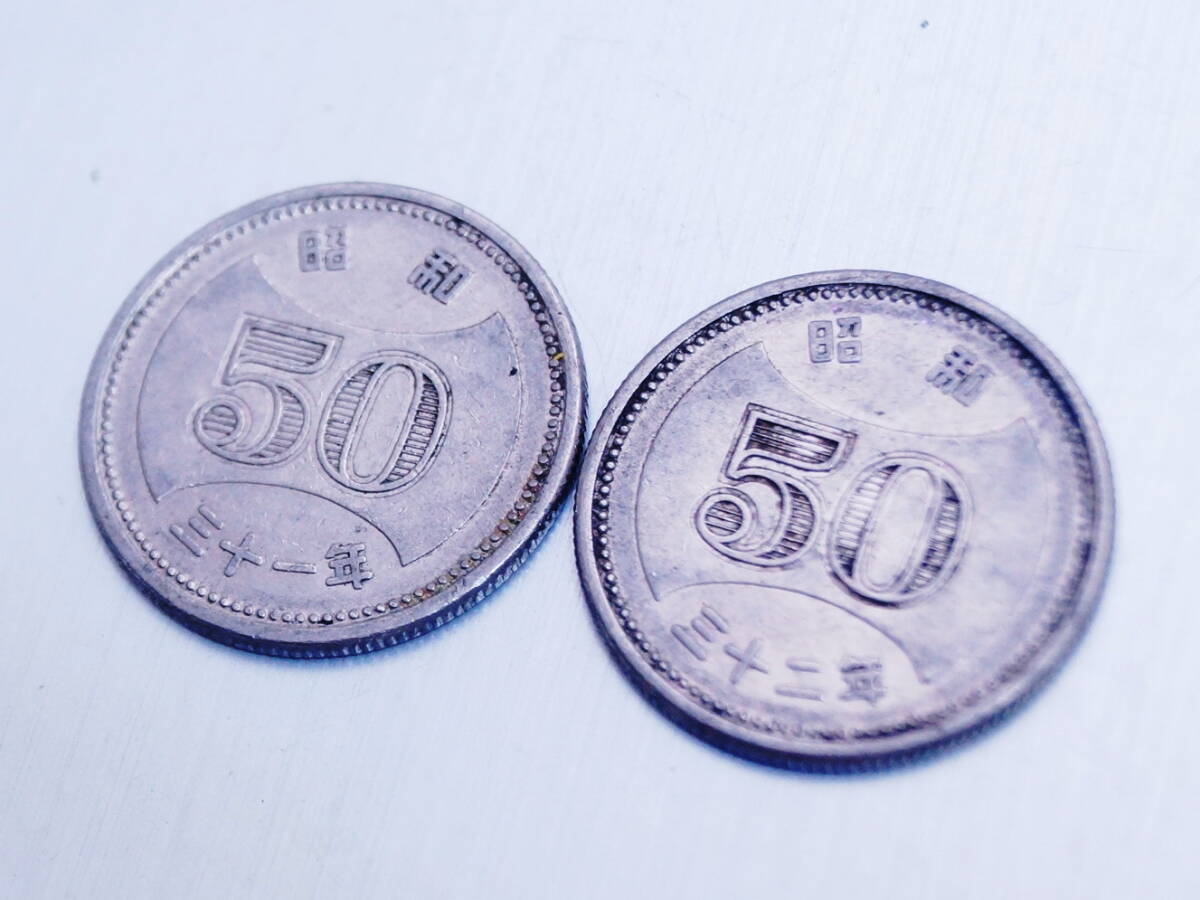 古銭★旧硬貨 50円 昭和 31年 32年 2枚セット 五十円 穴無し 菊 | |||