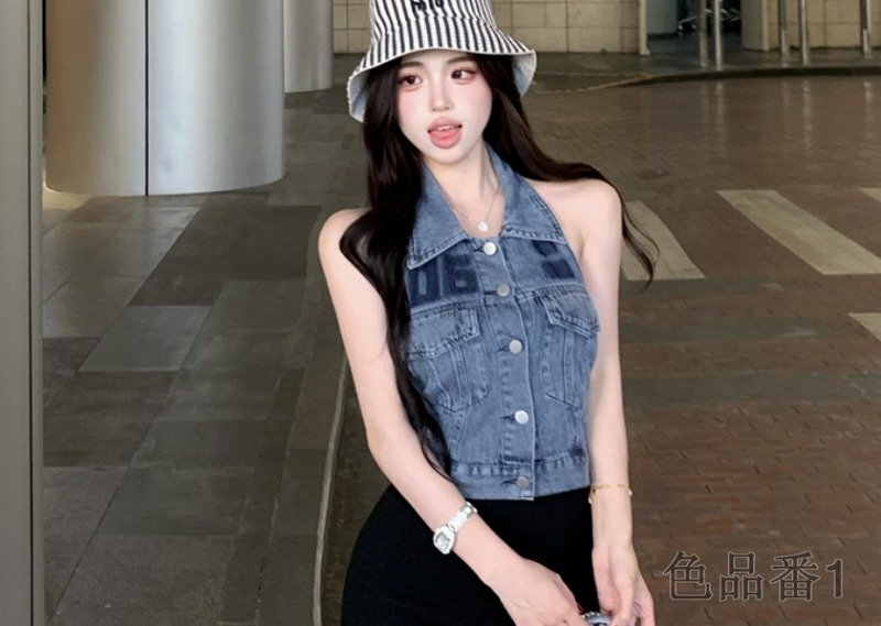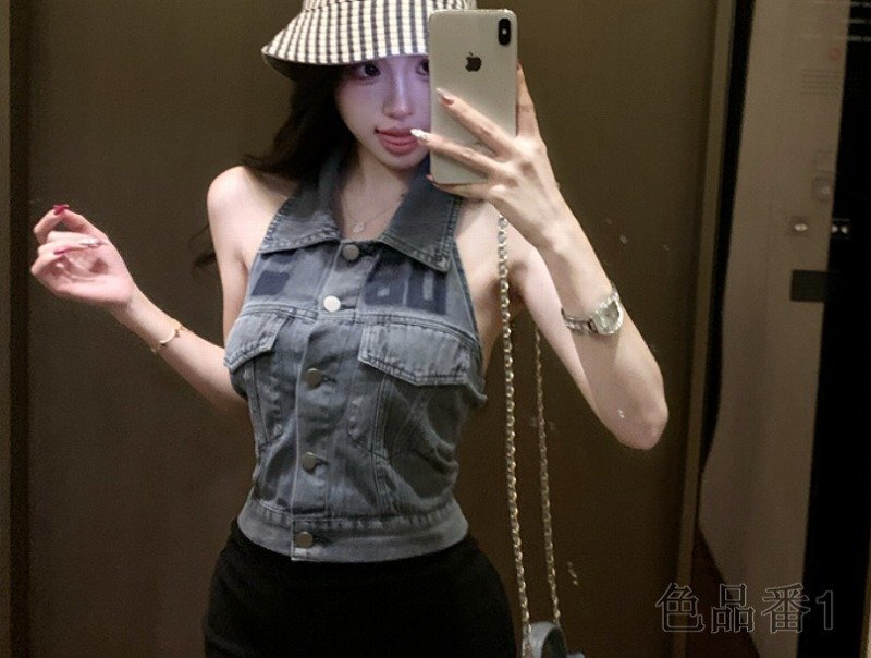 デニムシャツ タンクトップ ノースリーブ 袖なし シンプル カジュアル ストリート レディース S ブルー 收藏
