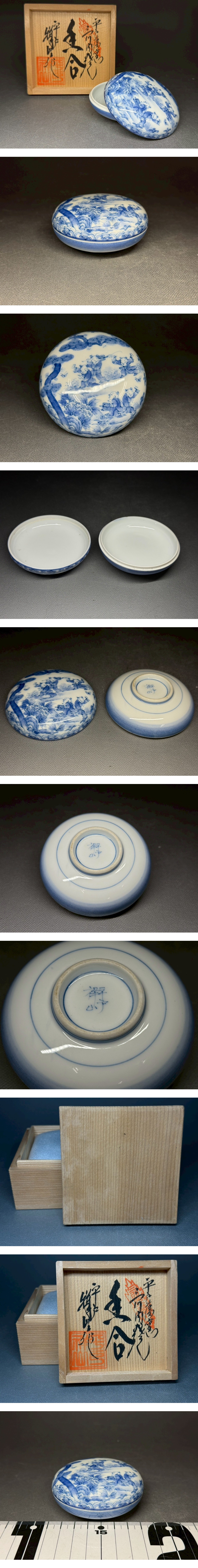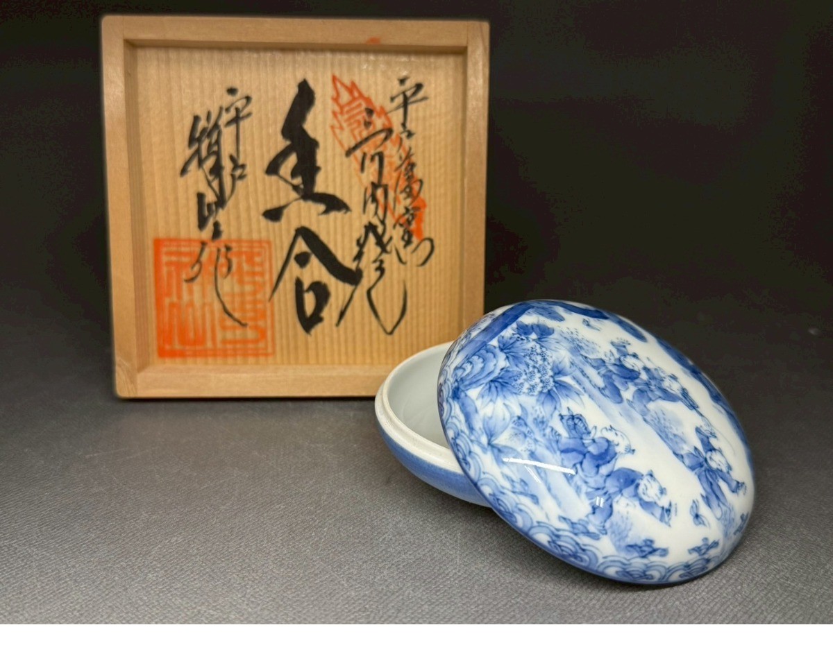 三川内焼 平戸窯 香合 平戸祥山作 唐子 染付 骨董 置物 飾物 日本伝統工芸品 芸術 古美術 時代物 在銘 落款 売切 香道具 茶道具6 收藏