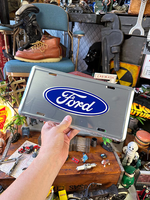 鈍いクロームに輝くフォードのロゴ入りライセンスプレートです。
