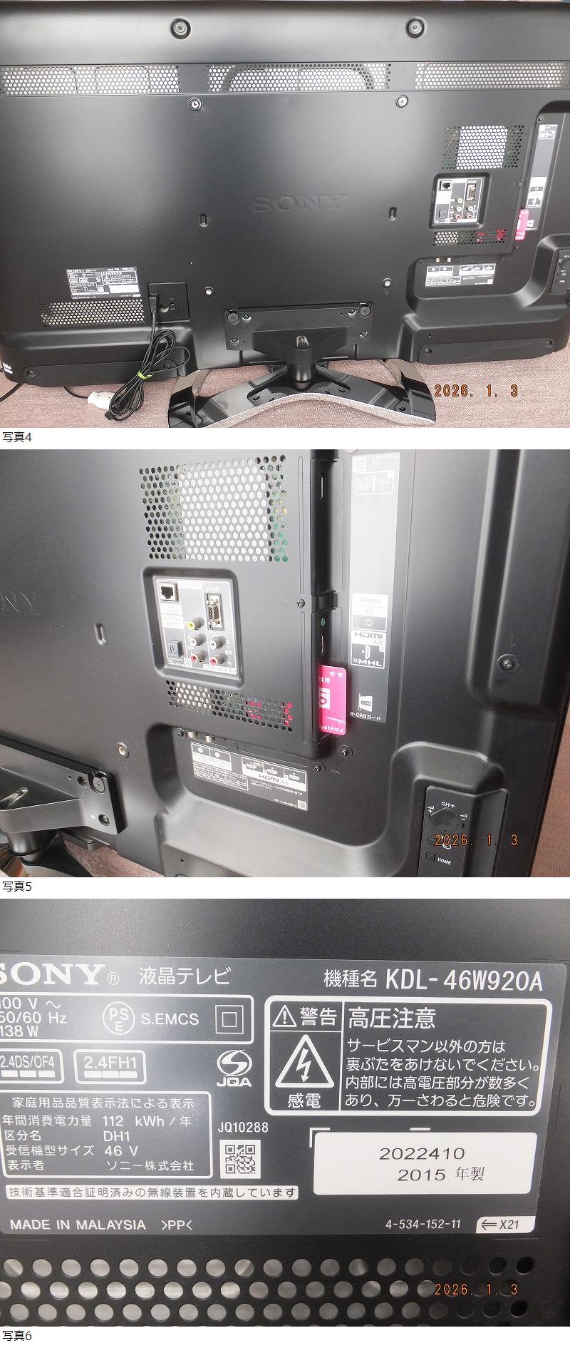 | SONY BRAVIA KDL-46W920A (2015) (ワンタッチリモコン付) 個人的に超美品・動作品 |