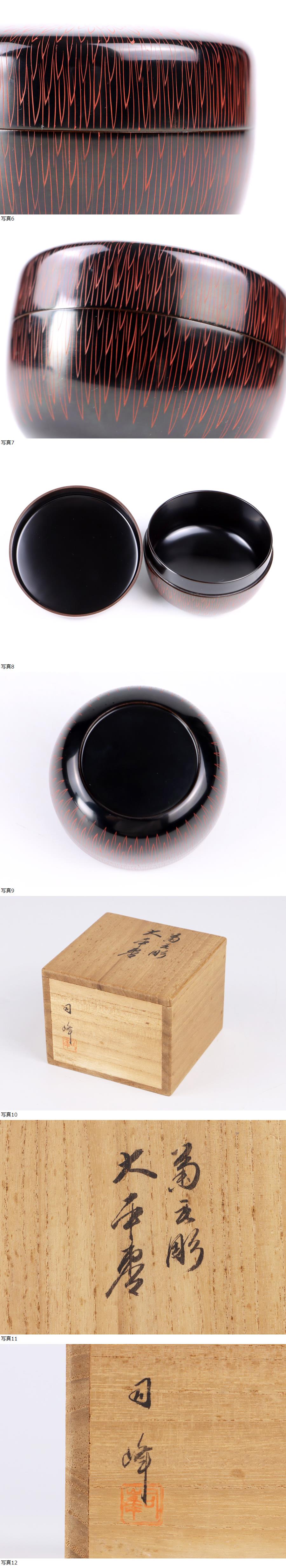サイズ(約) 高さ 7㎝/直径 7.3㎝/重量 81.7g 付属品 共箱 本物保証 新井司峰作 菊毛彫 大平棗 漆細工棗 共箱 未使用極上品! 本物保証 状態、未使用品 大事にしていただける方の入札お待ちしております! |