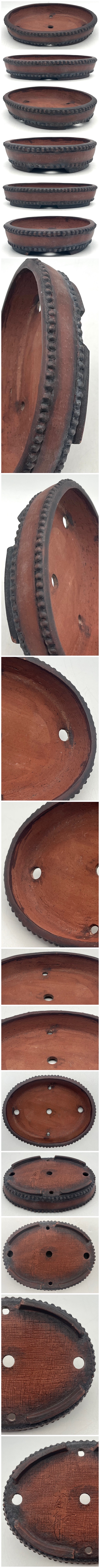 【鶴】常滑『富舟』作 紫泥 楕円太鼓型 豆鉢 小さい 植木鉢 H約3.3cm 約245.1g◯紫砂・豆盆栽・盆器・蘭鉢・朱泥・和鉢・古作・十王堂 A696 收藏