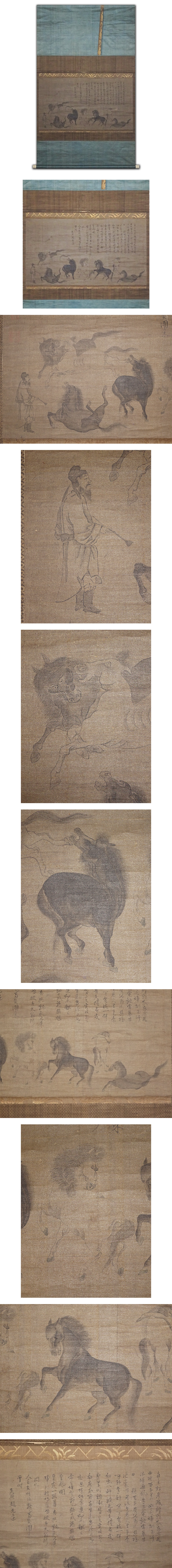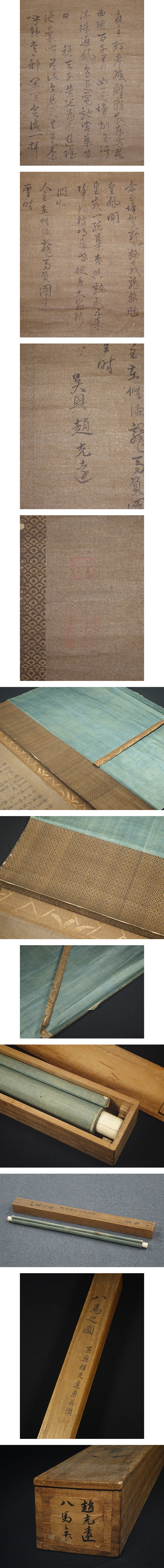 慶應◆中国人画家【趙光遠】真筆 絹本墨画『八馬之図』自画賛 掛軸 唐画 時代箱 收藏